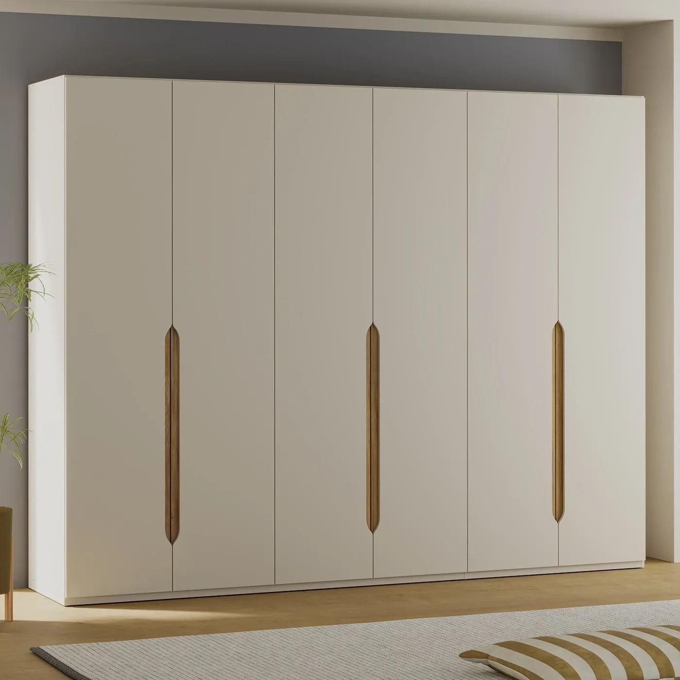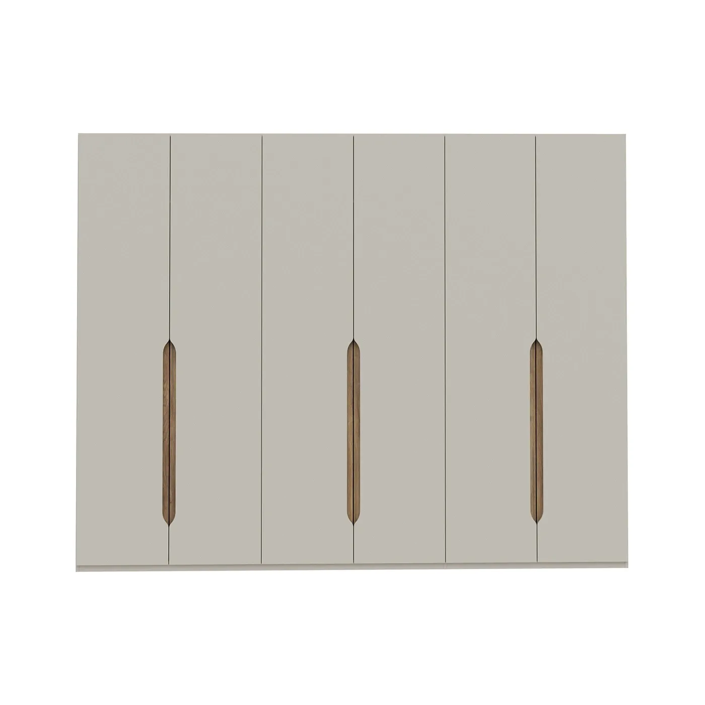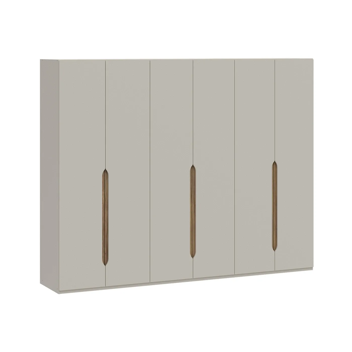 Armadio a 6 ante battenti per la zona notte e con maniglie a gola. La struttura è in finitura Sabbia, mentre l'inserto delle maniglie è color Rovere Mauvella. Disponibile assieme a 2 set di ripiani diversi.