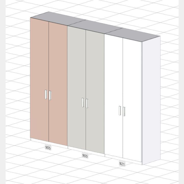 L'allestimento standard dell'armadio prevede un ripiano e due tubi appendiabiti per modulo, in totale verranno forniti 3 ripiani e 6 tubi.