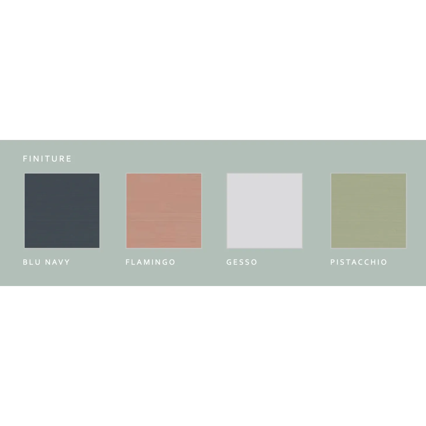 L'intero sistema è dominato da una combinazione di colori chic e riposante: il gesso, un grigio chiaro e soft, è usato per la maggior parte delle ante a tutta altezza, conferendo all'armadio una presenza importante ma mai pesante.