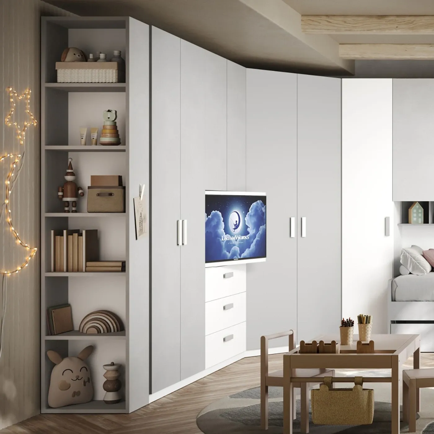 Armadio con cabina, pannello tv e libreria, Gesso e Bianco opaco