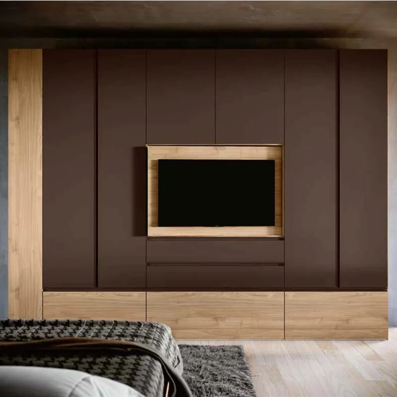 Progettato per offrire comfort e praticità nella zona notte l'armadio offre tutto ciò di cui si ha bisogno: spazio contenitivo per vestiti suddiviso in ante, cassetti e cestoni, un pannello girevole per collocare la tv ed una libreria terminale con due ante portascarpe.