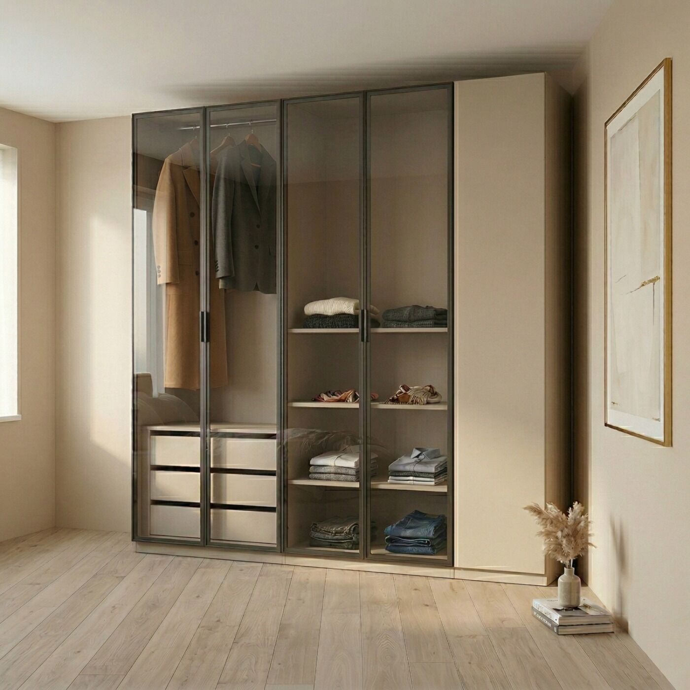 Le 4 ante in vetro fumé sono incorniciate da un sottile profilo metallico scuro. Questo tipo di vetro, leggermente oscurato, offre un tocco di mistero e raffinatezza, lasciando intravedere l'interno senza mostrare tutto.