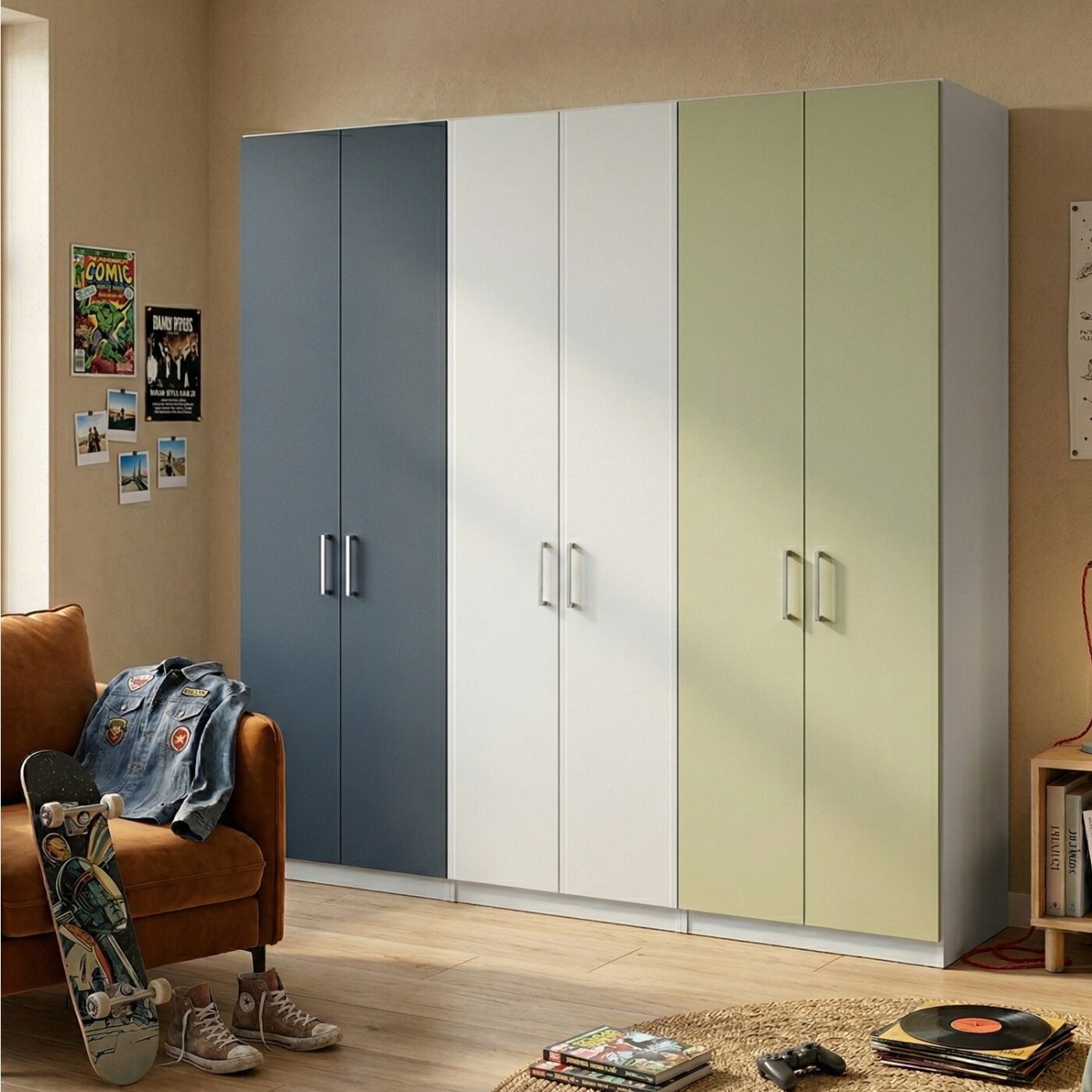 Armadio camerette a 6 ante, Blu navy, Gesso e Pistacchio, L.270
