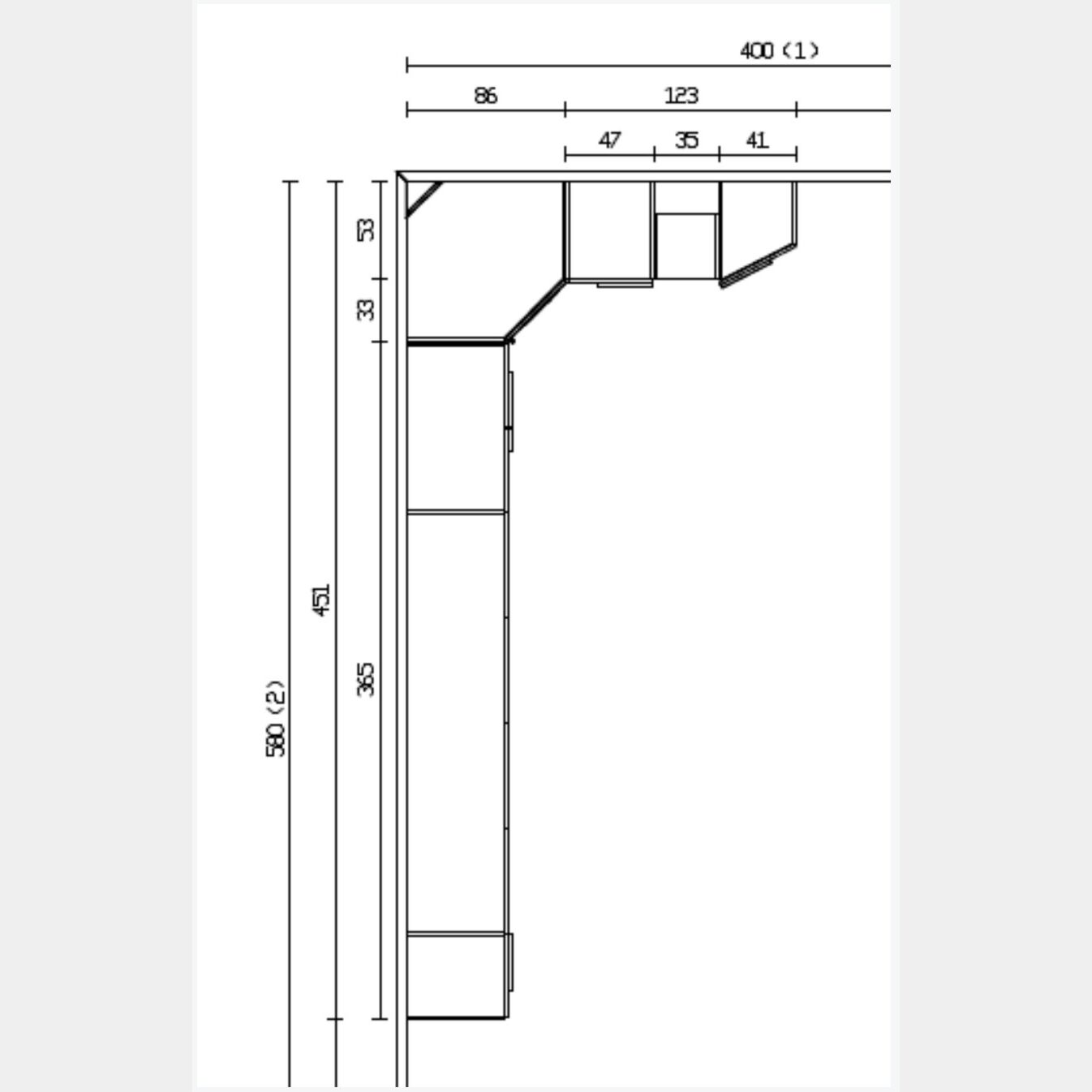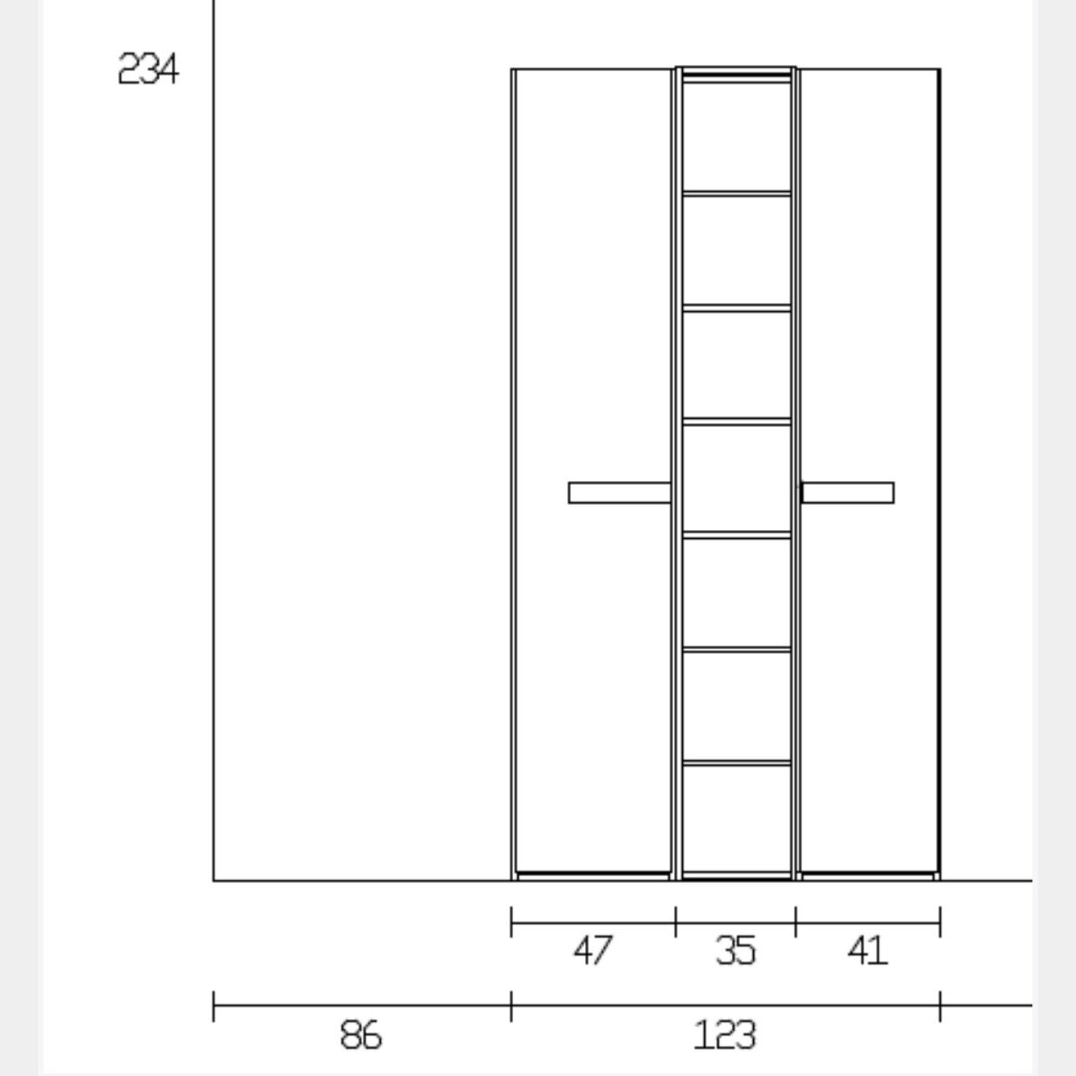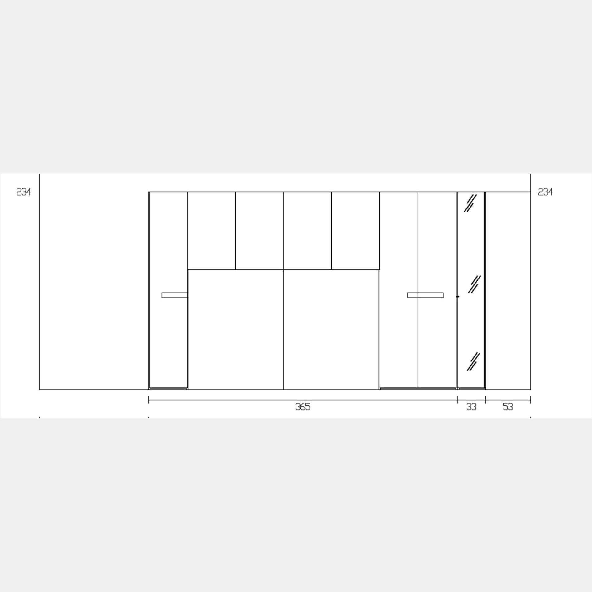 L'armadio è composto da un ponte, sostenuto da un modulo ad un'anta sulla sinistra e da un modulo a due ante sulla destra, un angolo con anta specchio, un modulo ad un'anta, una libreria e un terminale.