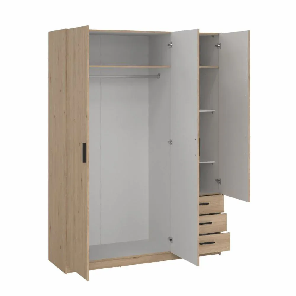 Armadio moderno e capiente in una finitura bellissima e molto fine ed elegante, Rovere. E' composto da tre cassetti in cui potete inserire i vostri vestiti al meglio in ordine, da tre ante battenti che sono caratterizzate da maniglie che garantiscono un facile accesso, da un tubo appendiabiti e da quattro ripiani.