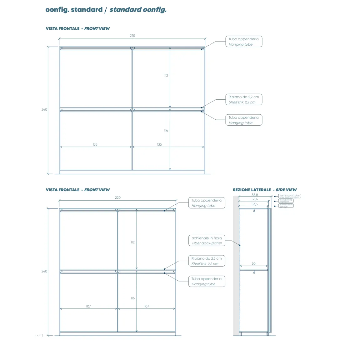 L'armadio viene fornito con un ripiano interno e due tubi appendiabiti, tramite configuratore è possibile personalizzare l'allestimento interno, richiedendo ulteriori ripiani, la scaffalatura con cassettiera e completarlo con ammortizzatori o luci.