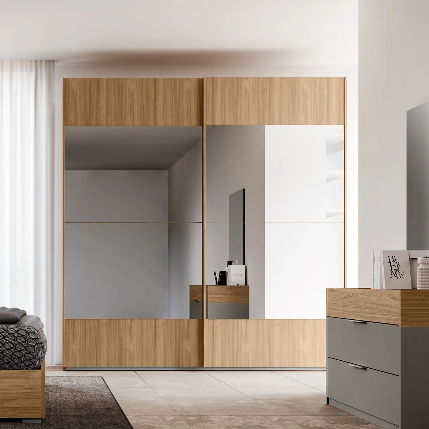 Le ante scorrevoli sono la soluzione salva-spazio per eccellenza: si aprono senza ingombrare, mantenendo un look minimalista e ordinato. La sottile linea orizzontale che divide gli specchi aggiunge un tocco geometrico discreto ma molto raffinato.
