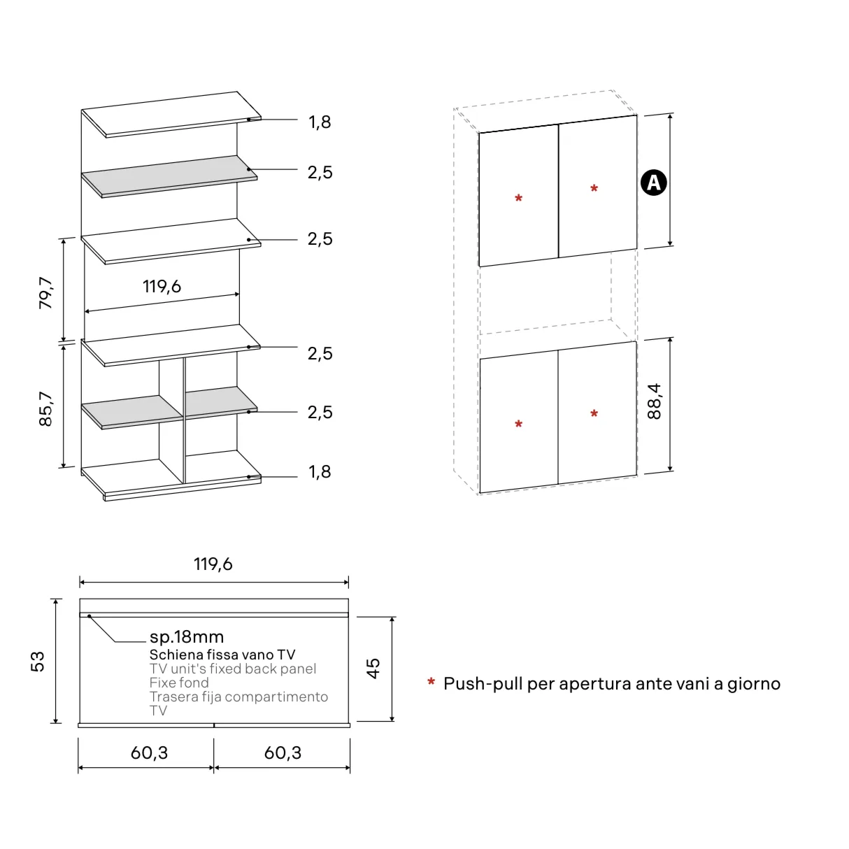 • Sp. fianchi/tramezzi: 18 mm