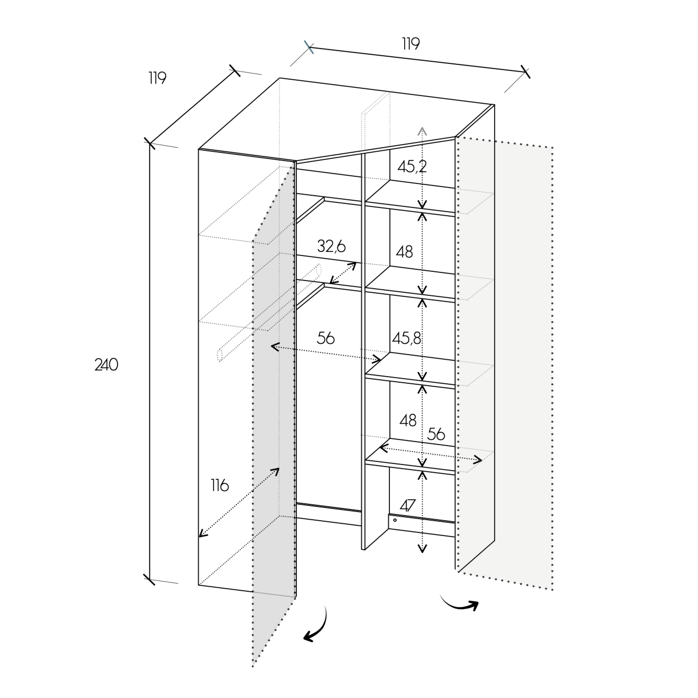 L'armadio è dotato di 8 ripiani interni e 1 tubo appendiabiti ed un tramezzo, perfetti per suddividere abiti, capotti, magliette e pantaloni.