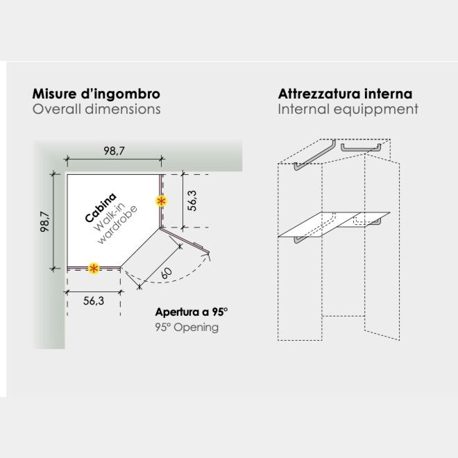 • Cabina: apertura ante 95°, L.60 cm. È dotata di un Ripiano interno con appen- diabiti, di un Tubo appendiabiti LUNGO e di uno CORTO.