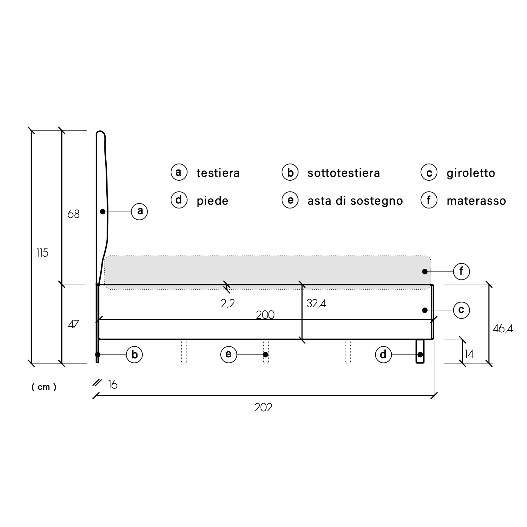 Rete e materasso devono avere dimensioni 160x195, non sono inclusi. È possibile richiedere la versione con contenitore, per ottenere spazio contenitivo extra.