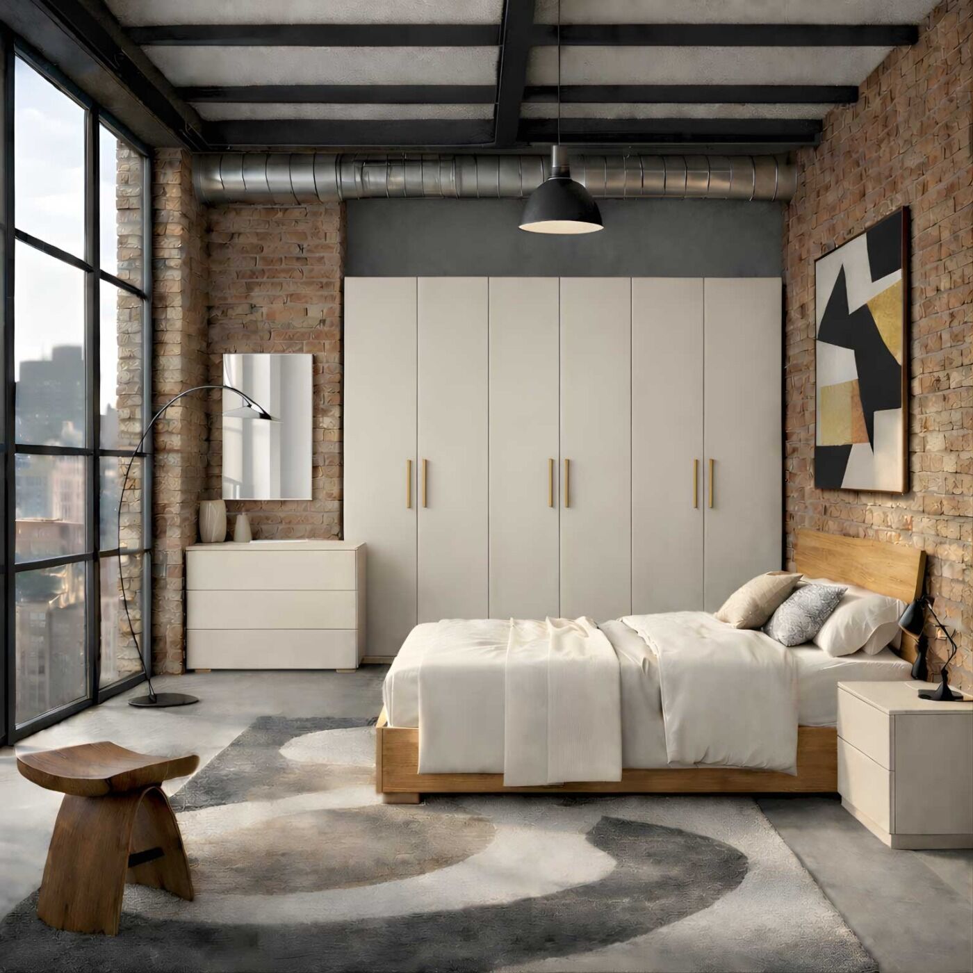 I fianchi e maniglie in Noce biondo creano un caldo contrasto con i frontali Orzo, rendendo la camera da letto moderna e accogliente.