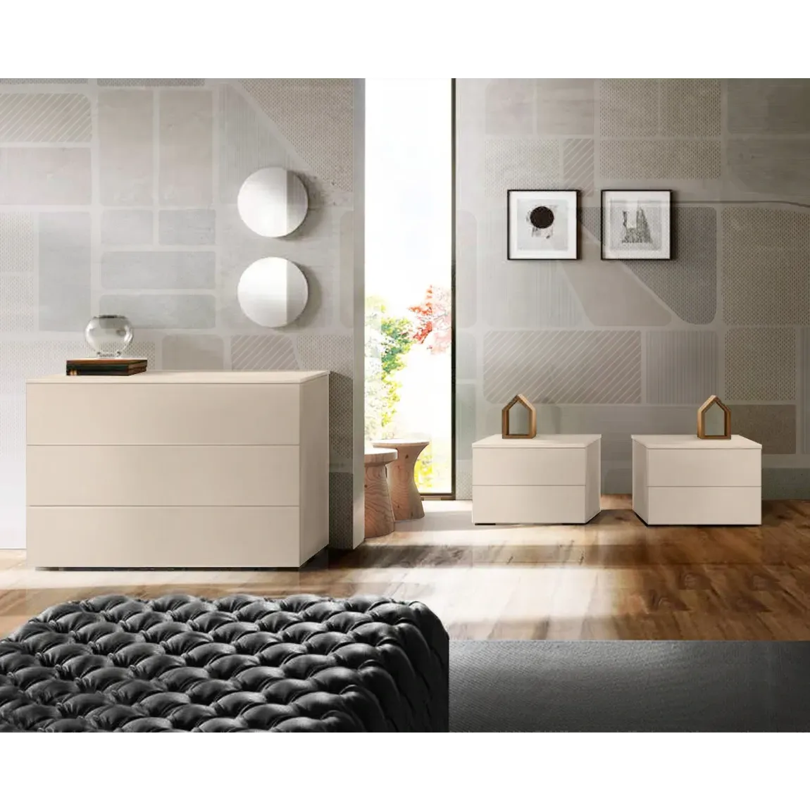 I due comodini che compongono la camera da letto hanno apertura a presa laterale, comoda e indiscreta per avere un design minimal e pulito: