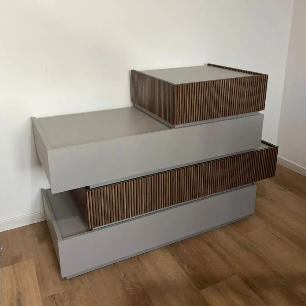 • Struttura armadio: Fianchi e tramezzi sono realizzatI in pannelli di particelle di legno classe E1 di spessore 18mm e sono predisposti di forature per fissaggio ferramenta. Ante spessore 18 mm con cerniere ammortizzate
