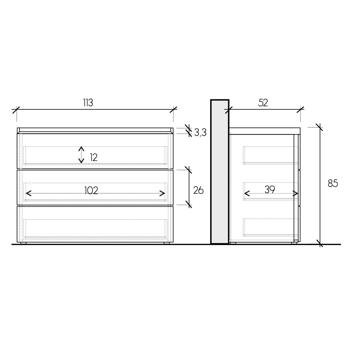 • Comò 3 cassetti: L.113 H.85 P.52
