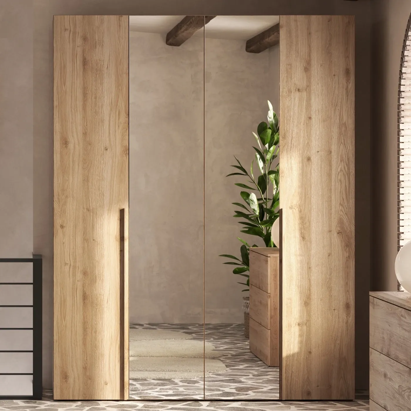Dotato di quattro ante battenti, di cui due con specchio, l'armadio assicura capienza e praticità: l'allestimento interno prevede un ripiano e due tubi appendiaibiti nell'anta di sinistra, due ripiani ed un tubo appendiabiti nell'anta di destra.