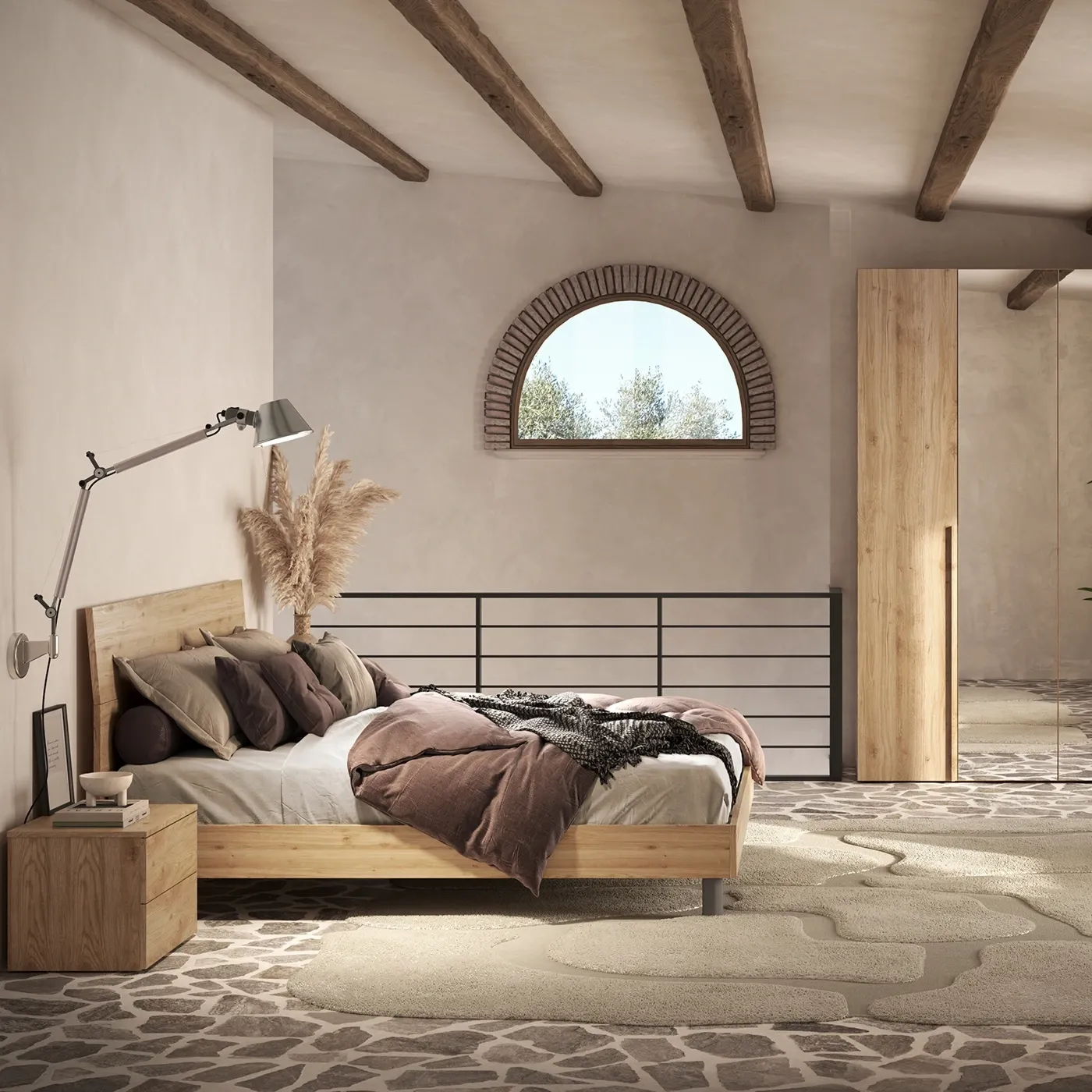 La camera ha stile rustico moderno, realizzata in tinta Cadiz che dona calore e luminosità.