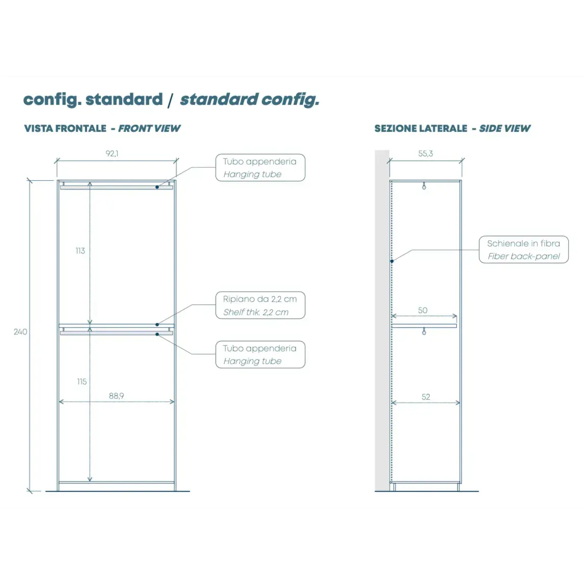 L'allestimento standard prevede un ripiano e due tubi appendiabiti per modulo, è possibile personalizzarlo con altri ripiani, luci, cassettiere, servetti e cestelli estraibili.