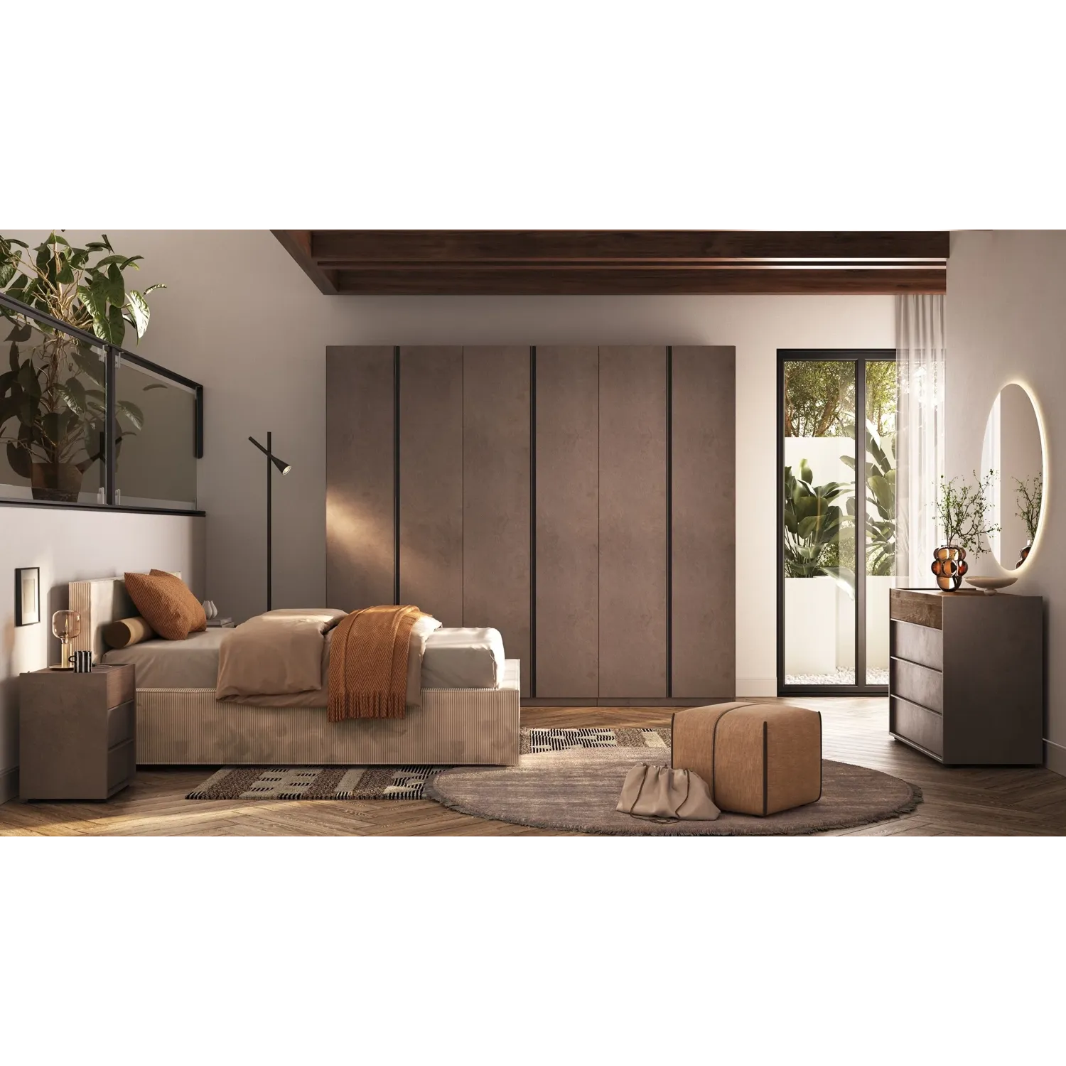 Camera matrimoniale con armadio 6 ante e letto imbottito, Bronzo e Mercure