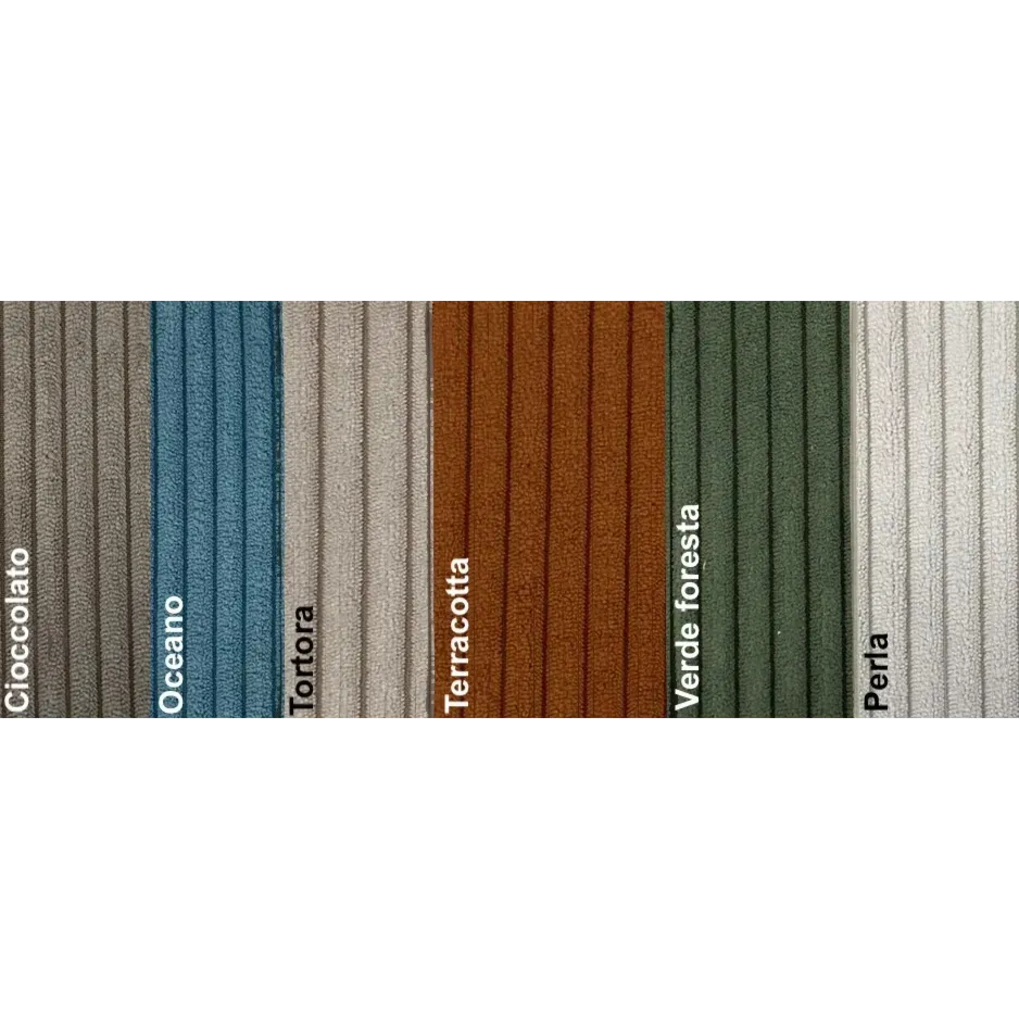 Il letto presenta coste verticali in velluto che aggiungono quel tocco "materico" che trasforma un mobile semplice in un pezzo di design.