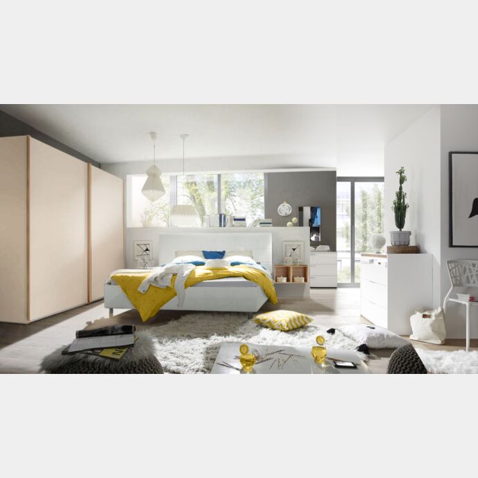 Camera moderna completa in finitura Noce Biondo, Orzo ed ecopelle bianca