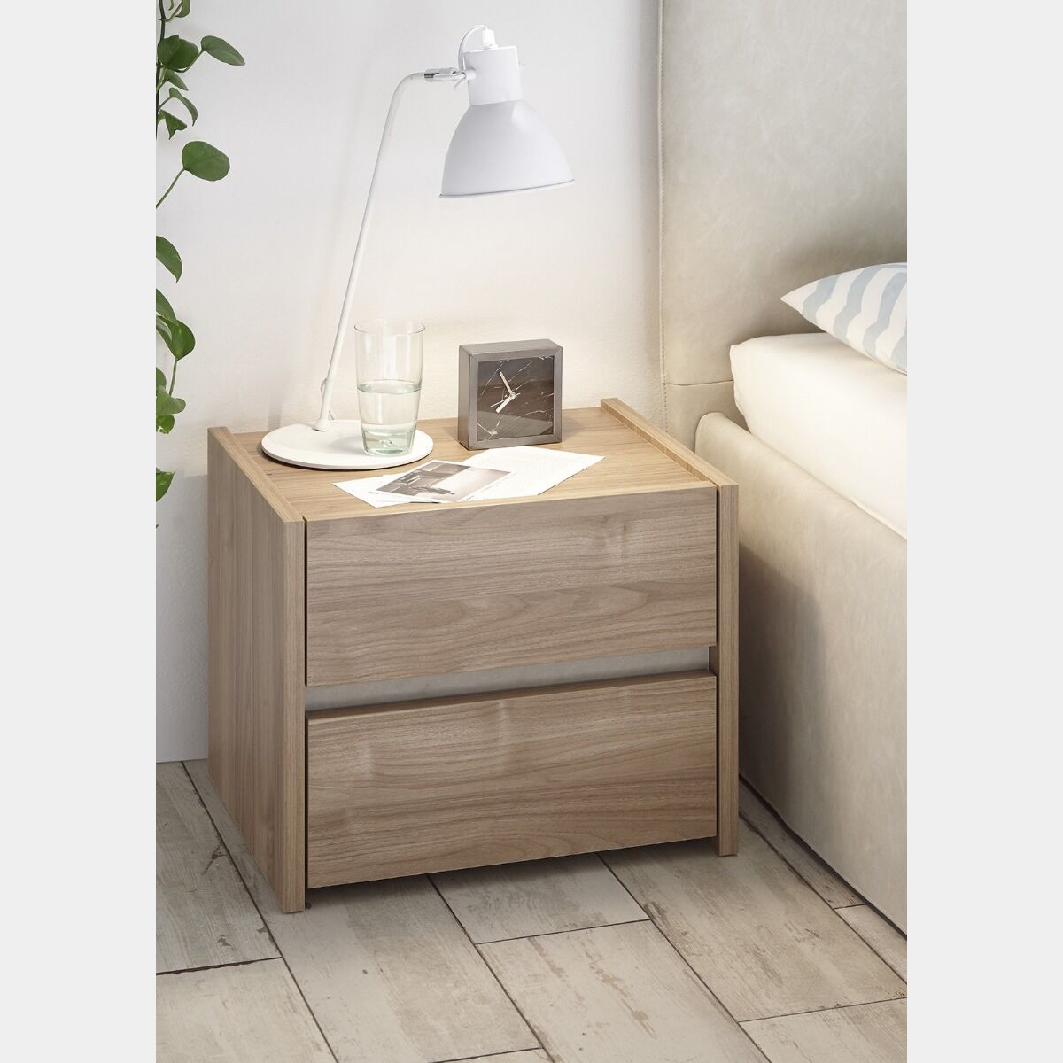 - Coppia Comodini a 2 cassetti in Noce Chiaro e Argilla. Il comodino ha la struttura e cassetti con uno spessore di 22mm. Le guide del cassetto sono ammortizzate. Ai comodini è possibile aggiungere la luce LED creando un mondo di effetti.- Misure Comodini: L.51 H.42 P.40 cm