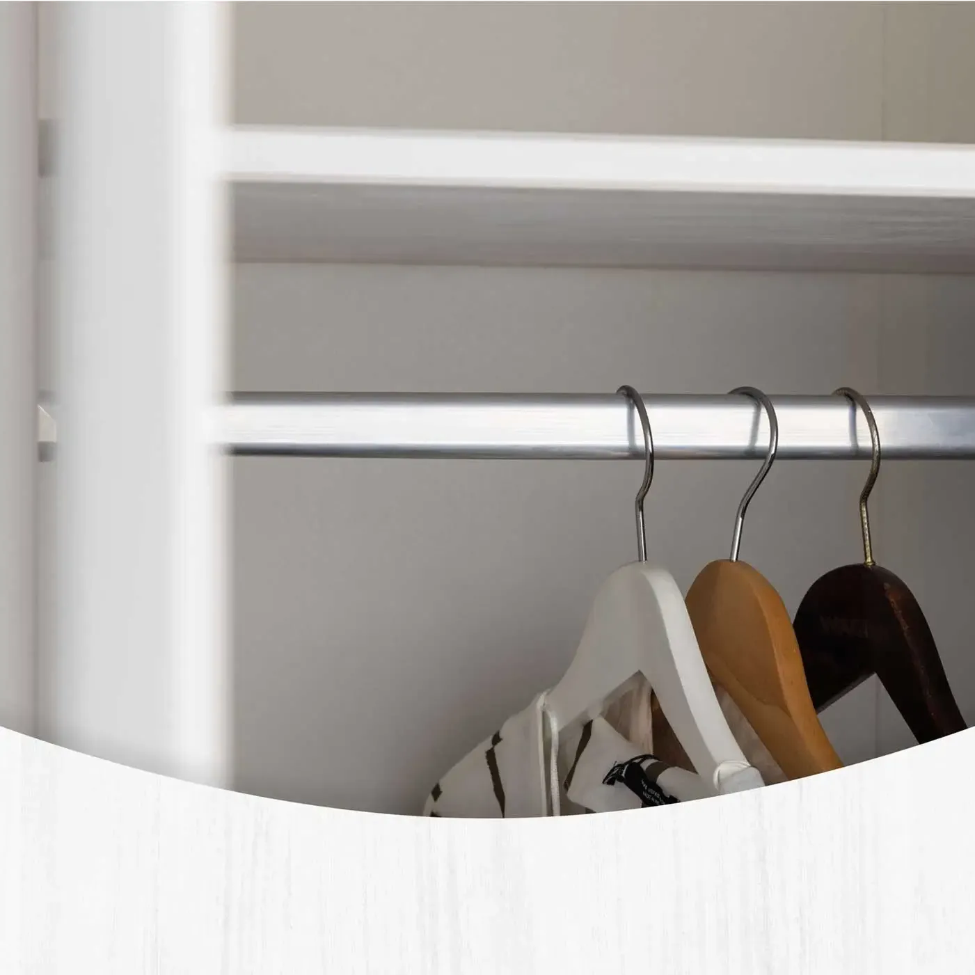 - Armadio salvaspazio per differenti ambienti della casa. L'articolo possiede 3 ante con maniglie a pomello in metallo mentre al suo interno propone 5 ripiani (uno più grande) sotto al quale si pone un comodo tubo appendiabiti, i quali riescono a sostenere entrambi un massimo di 10 Kg mentre i 4 ripiani più piccoli arrivano fino a 5 Kg di tenuta.