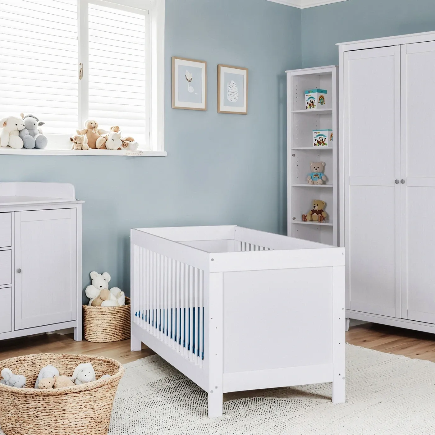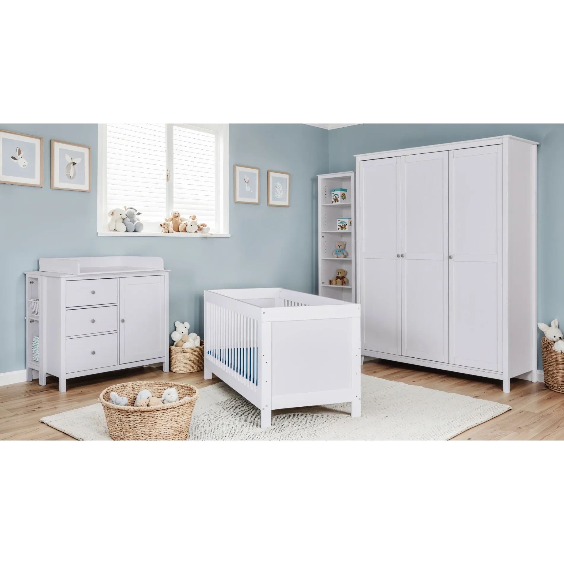 All'occorrenza il mobile può essere trasformato in un comodo fasciatoio grazie all'aggiunta separata del piano per il cambio con i bordi arrotondati e di una doppia scaffalatura (2 pezzi) con un ripiano a giorno, da porre dietro alla cassettiera, il quale offre spazio aggiuntivo per pannolini, asciugamani e altri articoli essenziali per il cambio.