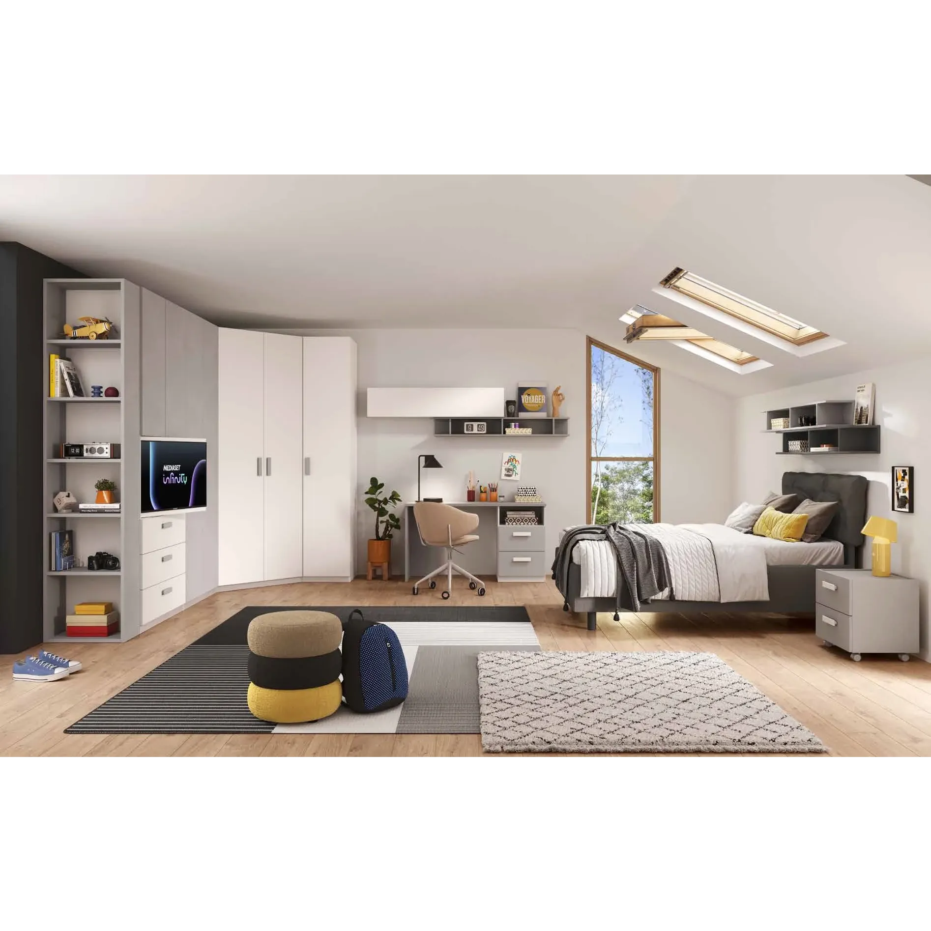 Cameretta con armadio angolare e letto contenitore, Bianco opaco e Gesso