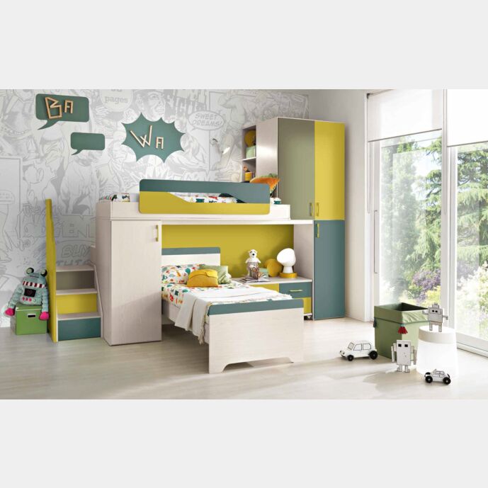 Cameretta con soppalco Chiara, finitura Betulla, Senape, Petrolio e Salvia