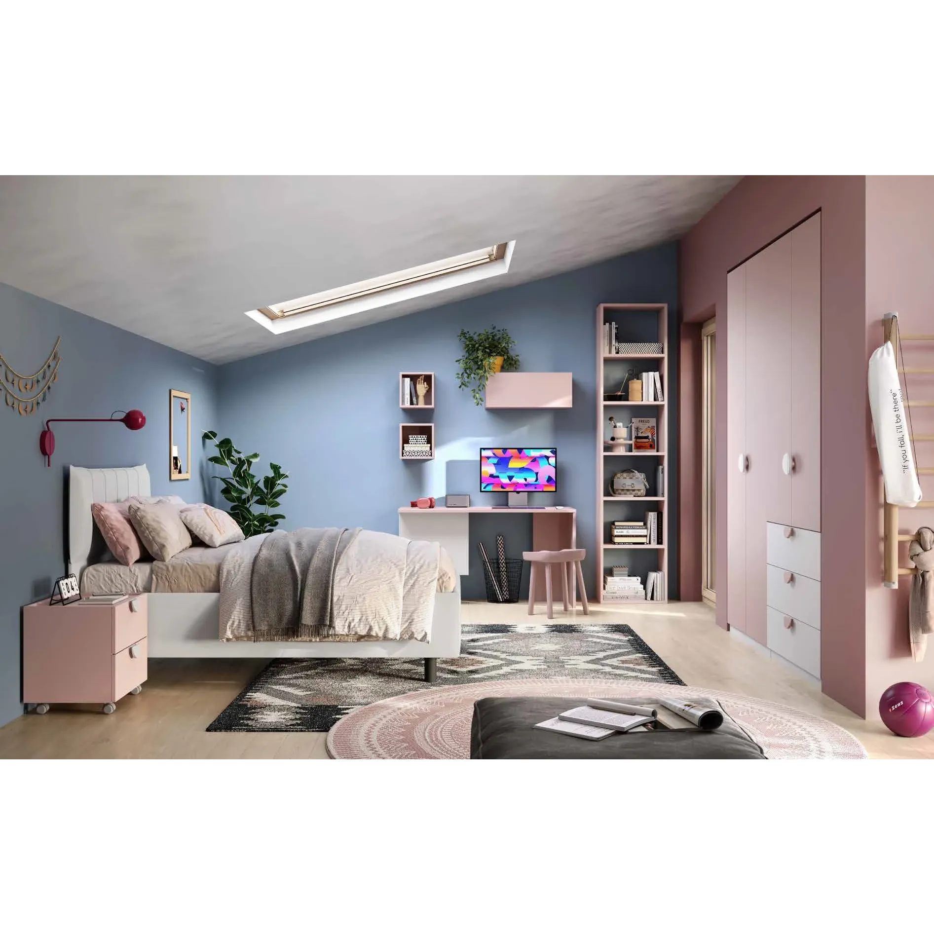 Cameretta ragazza con armadio, letto contenitore e comodino, Bianco opaco e Flamingo