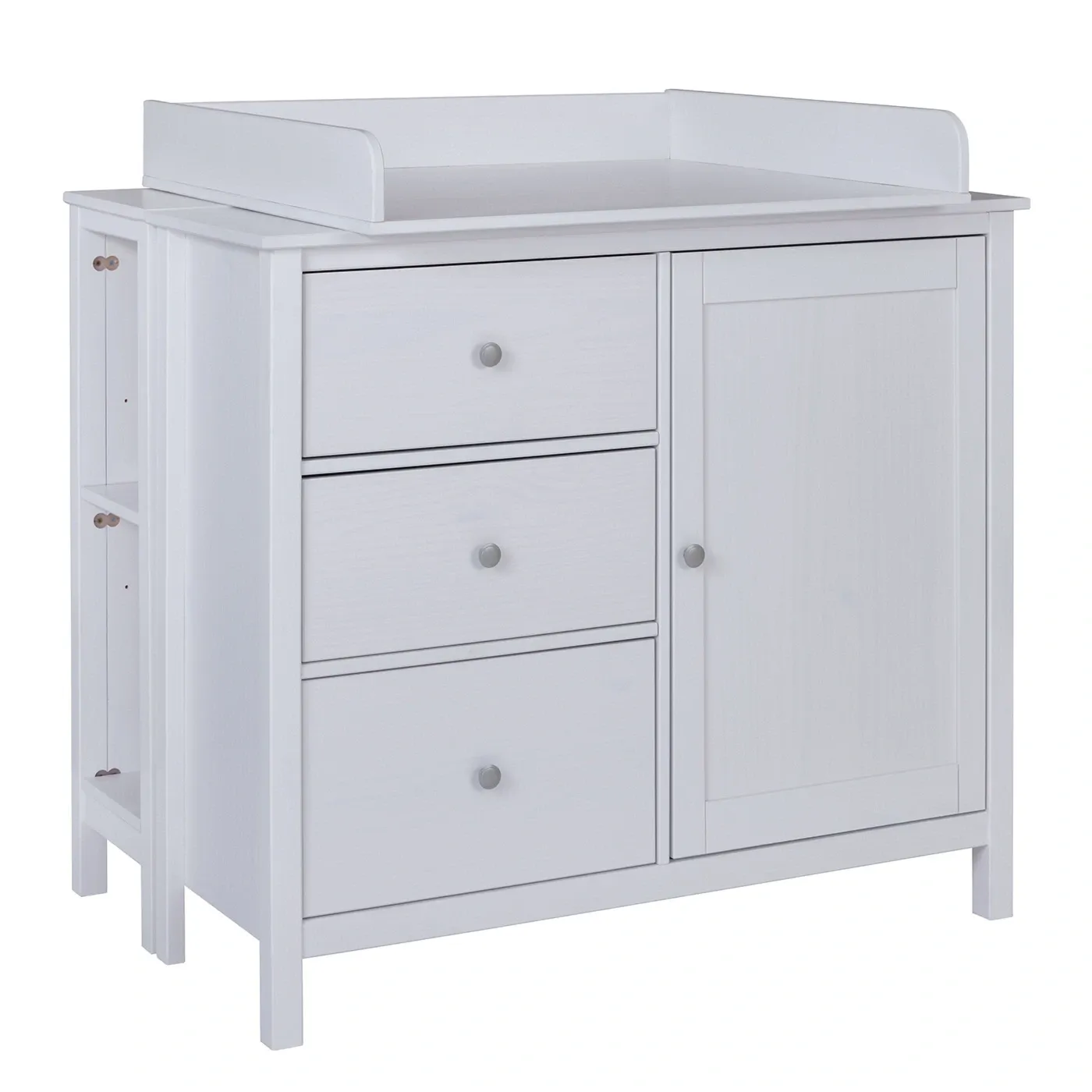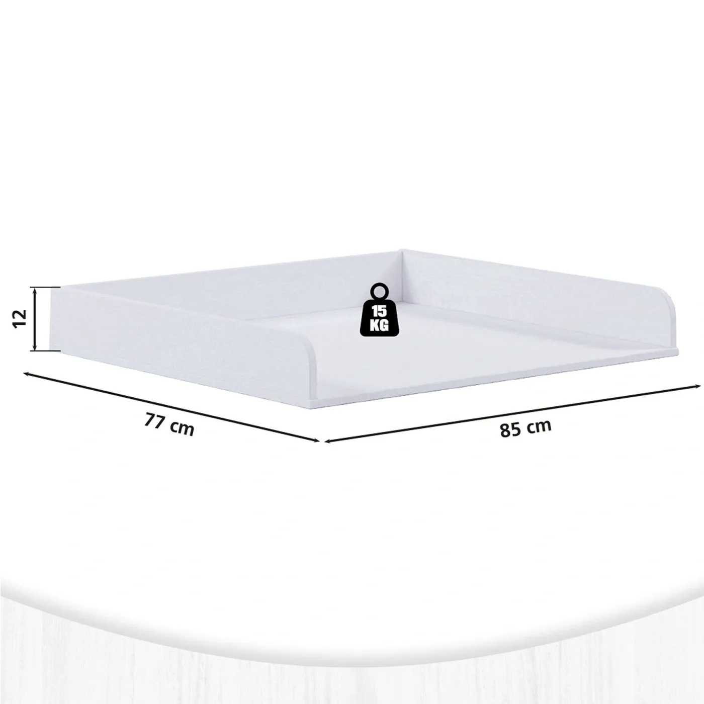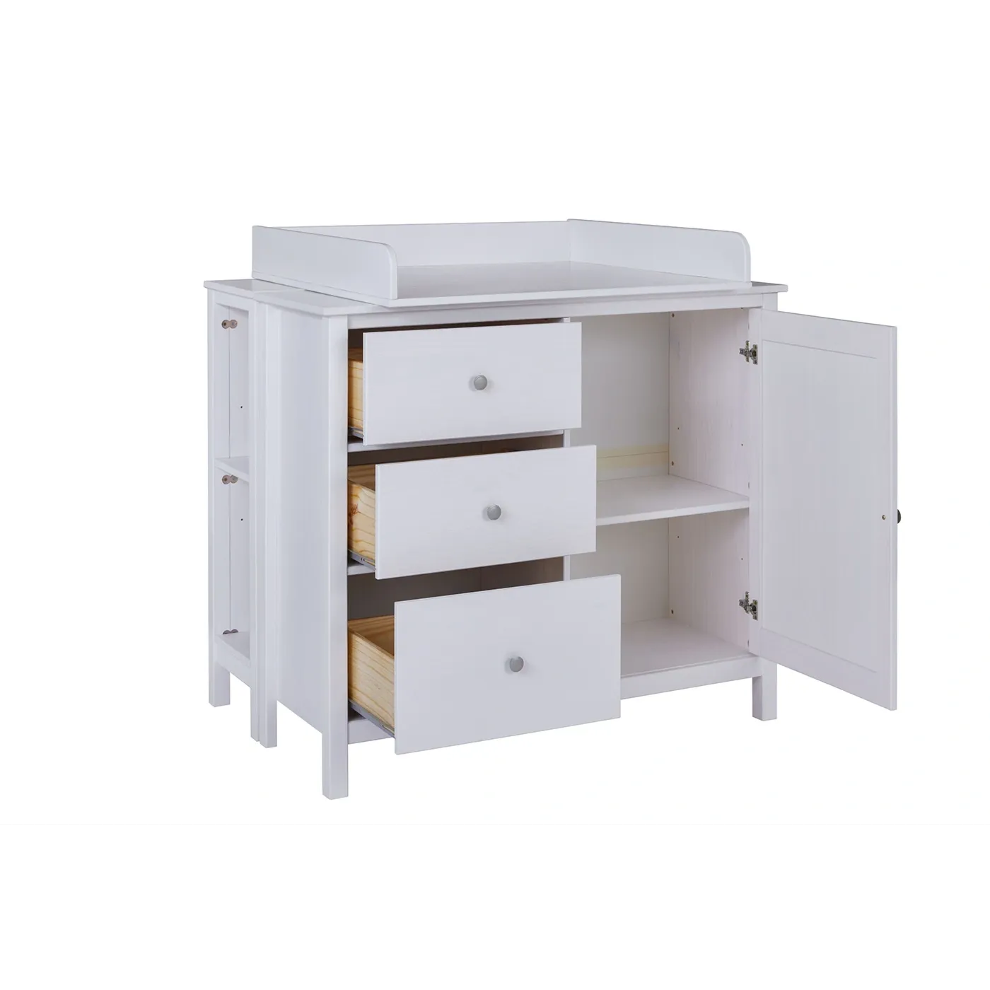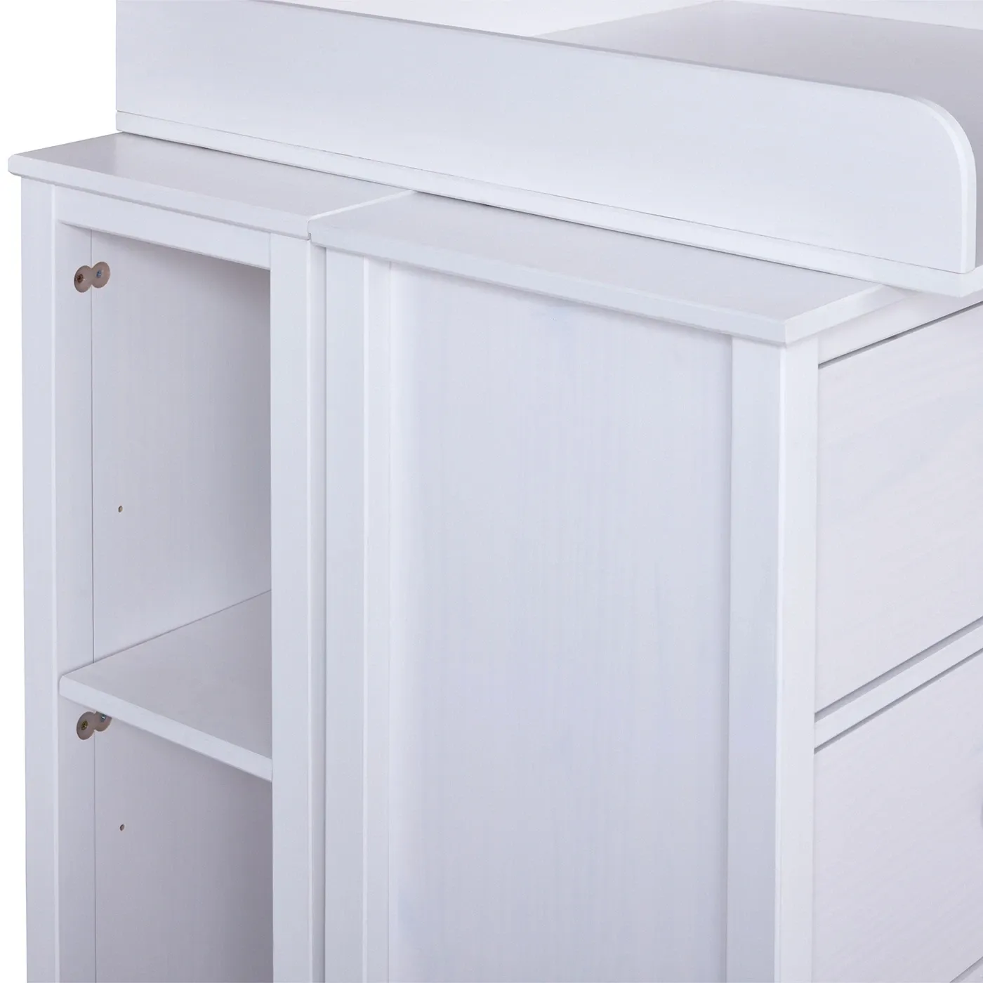 All'occorrenza il mobile può essere trasformato in un comodo fasciatoio grazie all'aggiunta separata del piano per il cambio con i bordi arrotondati e di una doppia scaffalatura (2 pezzi) con un ripiano a giorno, da porre dietro alla cassettiera, il quale offre spazio aggiuntivo per pannolini, asciugamani e altri articoli essenziali per il cambio.