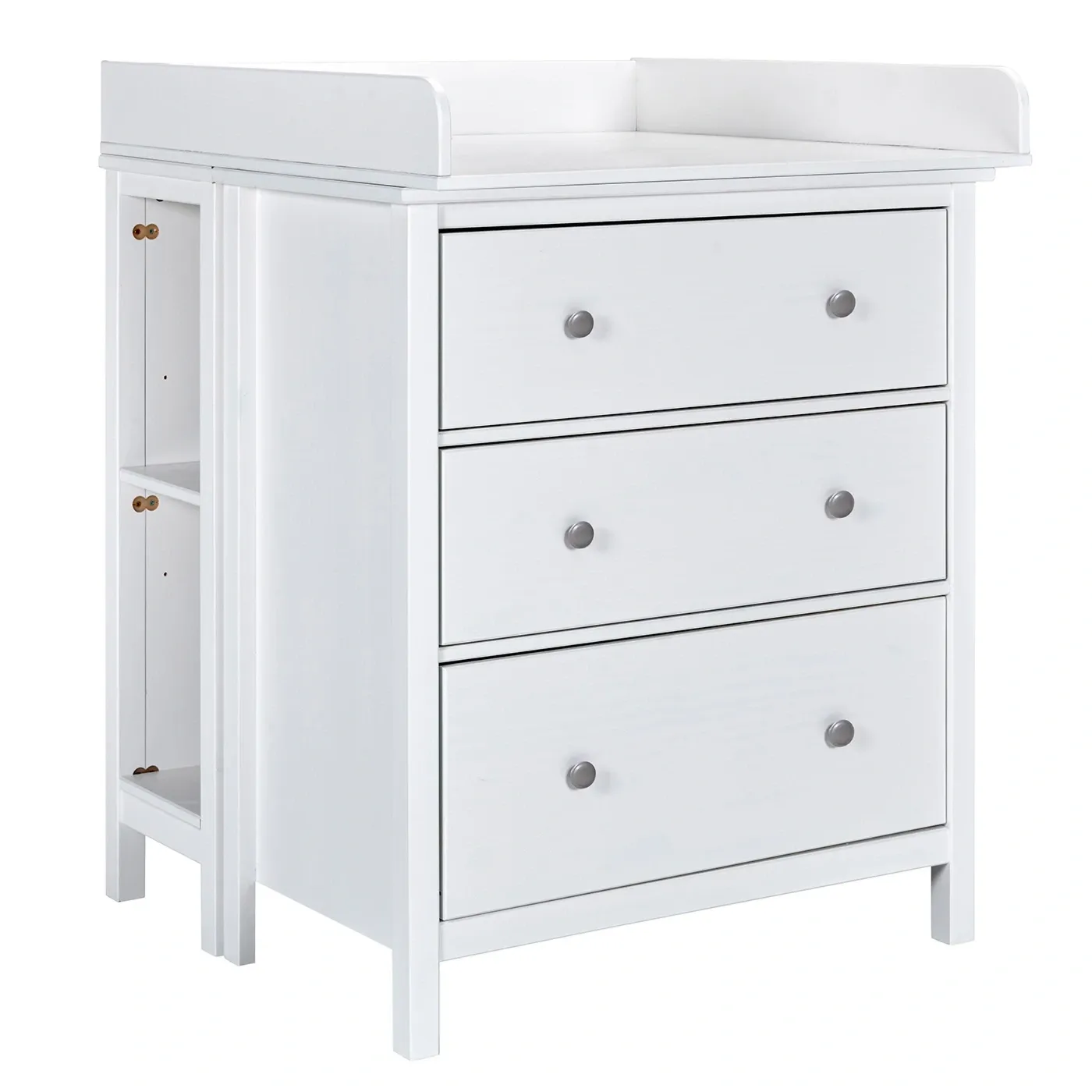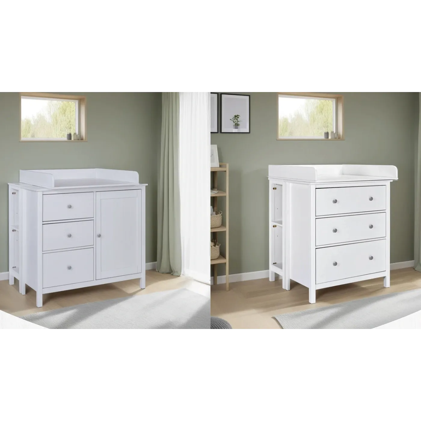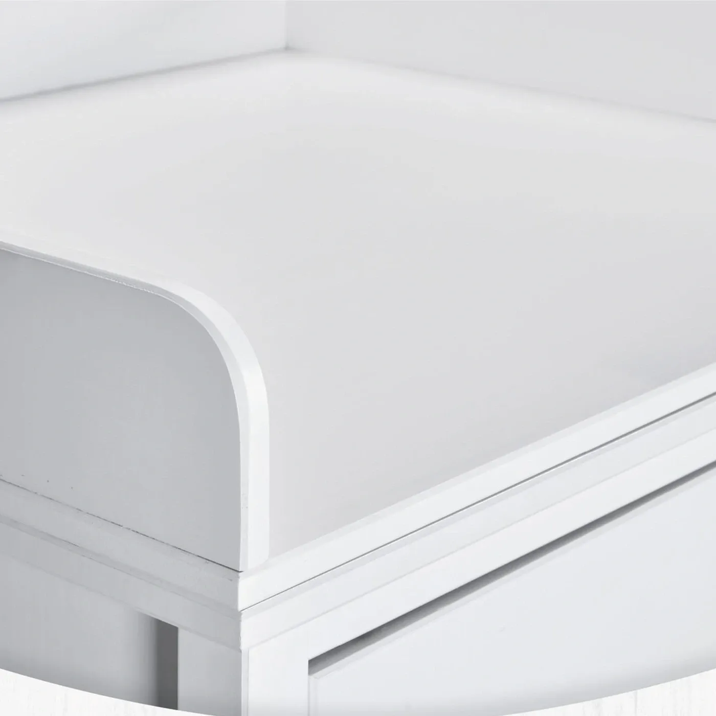 All'occorrenza il mobile può essere trasformato in un comodo fasciatoio grazie all'aggiunta separata del piano per il cambio con i bordi arrotondati e di una doppia scaffalatura (2 pezzi) con un ripiano a giorno, da porre dietro alla cassettiera, il quale offre spazio aggiuntivo per pannolini, asciugamani e altri articoli essenziali per il cambio.