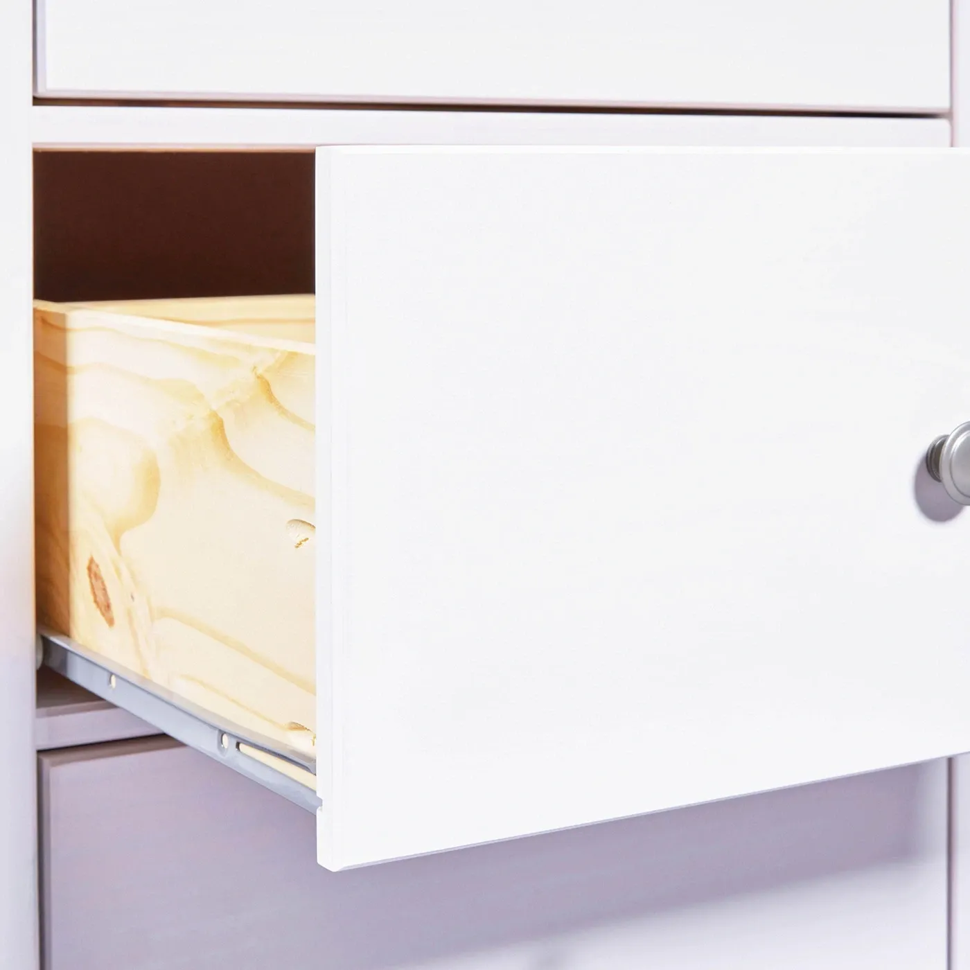 Il fondo dei singoli cassetti è in Bianco laccato come la struttura, la quale però riesce a riprodurre con la sua finitura anche le venature naturali del legno.
