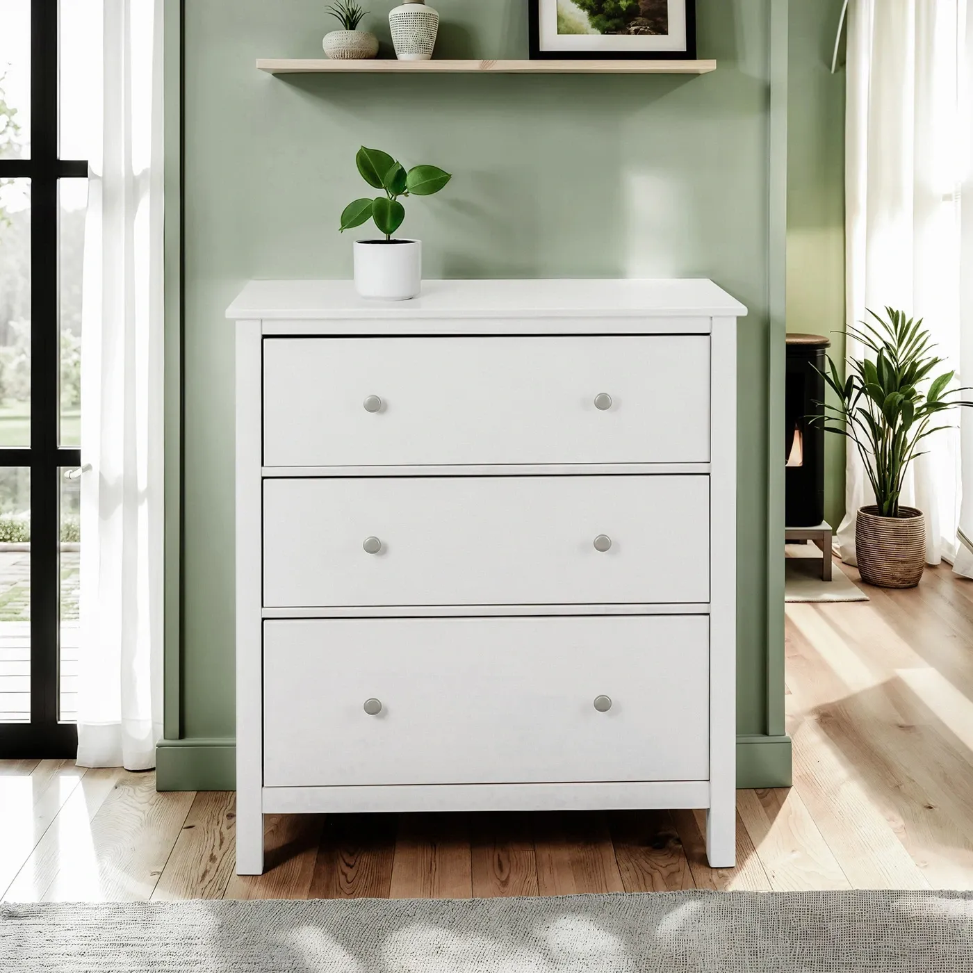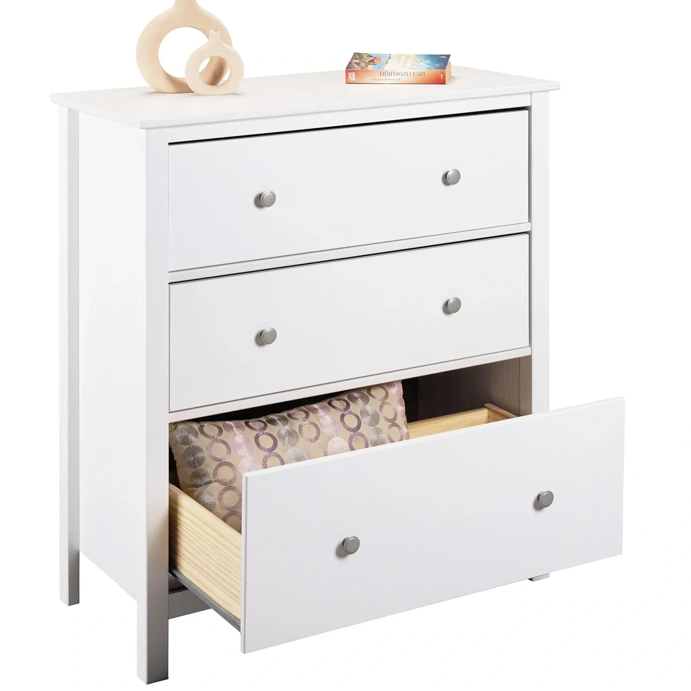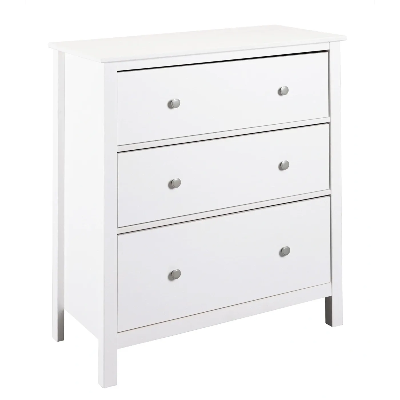 Cassettiera a 3 cassetti con pomelli e guide in metallo. La struttura e la base dei cassetti sono in Bianco venato e laccato. Ideale all'interno di una cameretta per bambini.