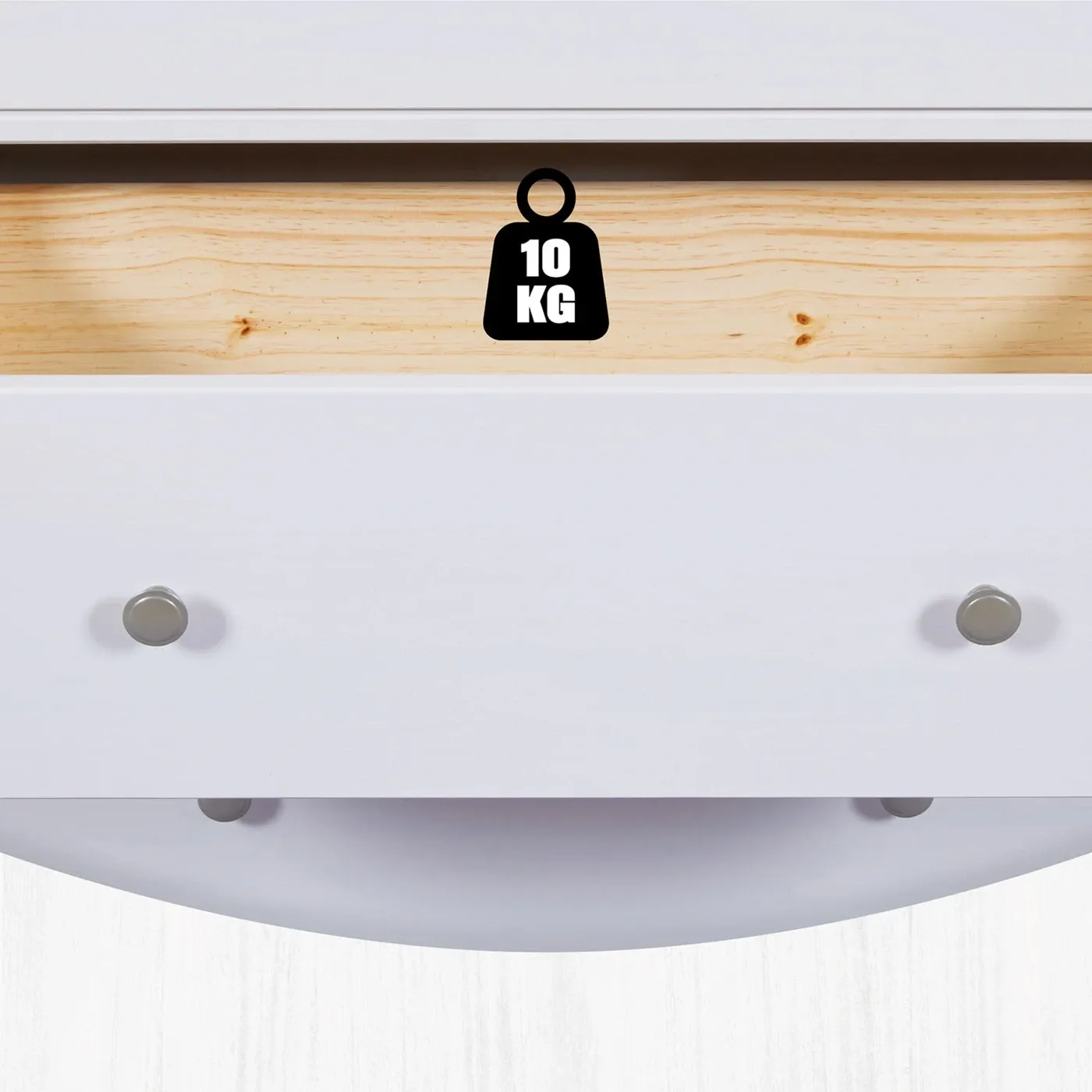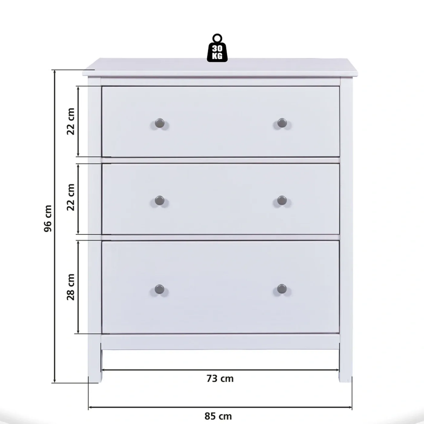 Ogni cassetto può contenere oggetti fino ad un massimo di 10 kg ed è dotato di guide metalliche. I primi due misurano L.68 H.25 P.34 mentre il terzo L.68 H.19,5 P.34. Le maniglie sono a doppio pomello e sono anch'esse in metallo.