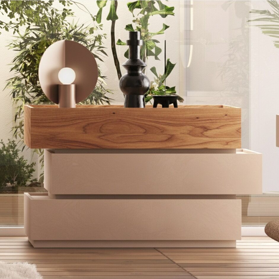 Questo comò gioca tutto sul contrasto armonioso tra due finiture che sembrano fatte l'una per l'altra.