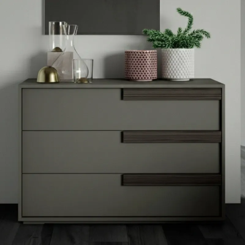 Comò moderno 3 cassetti, Grigio cenere con maniglie cannettato grigio, L.115