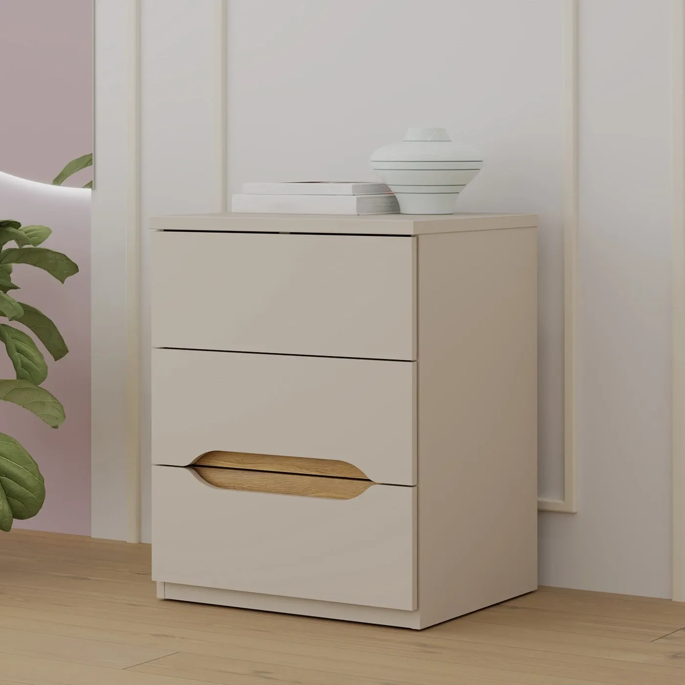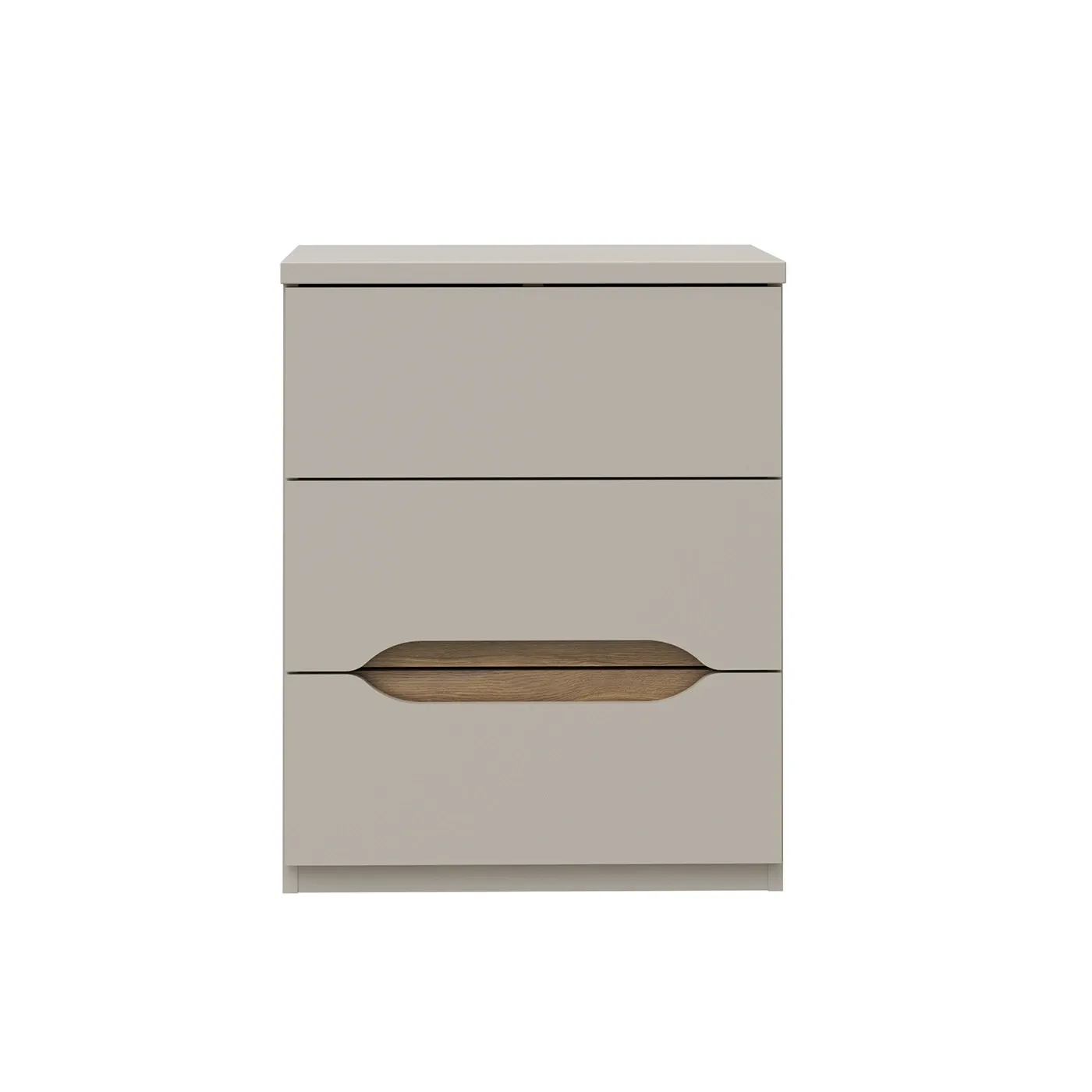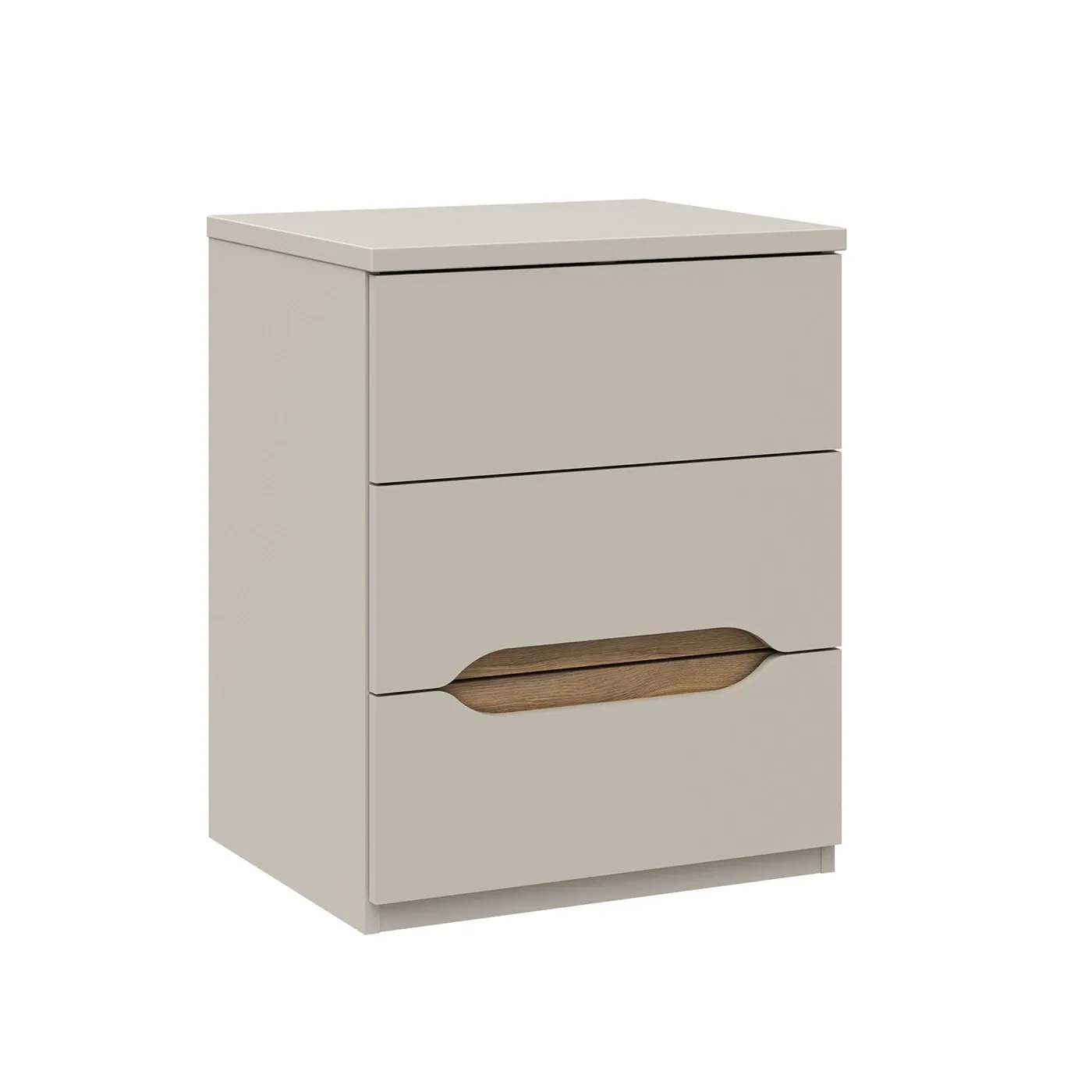 Comodino a 3 cassetti in finitura Sabbia, ideale per l'arredamento della camera da letto. Si distingue per l'elegante inserto centrale, che funge anche da maniglia a gola, in finitura Rovere Mauvella.