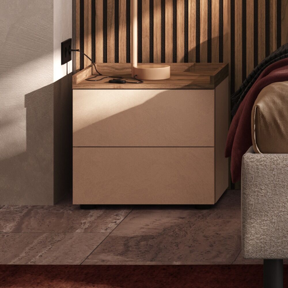 Comodino 2 cassetti moderno, finitura Cashmere e Noce caramello