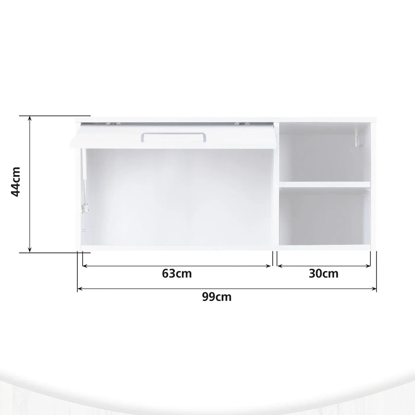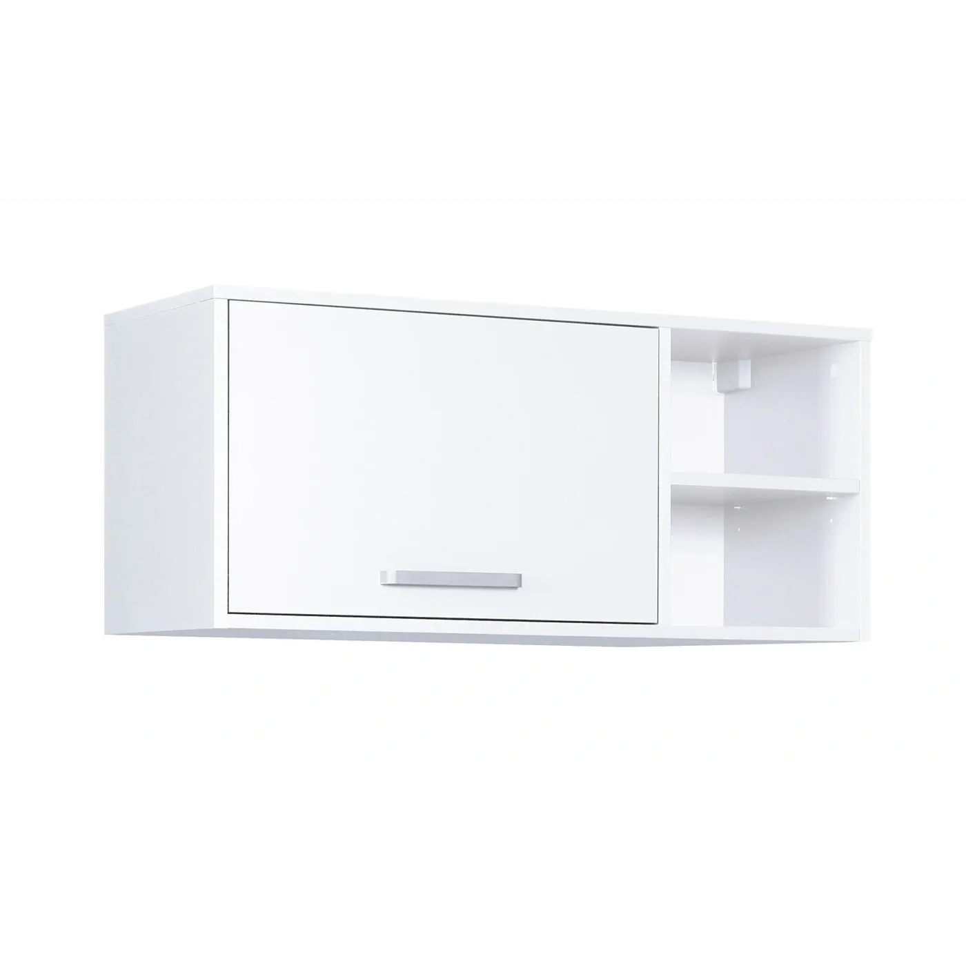 - un pensile sospeso ad un'anta a ribalta con chiusura soft close e di 3 ampi vani contenitori di cui 2 a giorno, ideale per contenere oggetti come asciugamani, detersivi o altri strumenti per la pulizia. Le maniglie sono in alluminio.