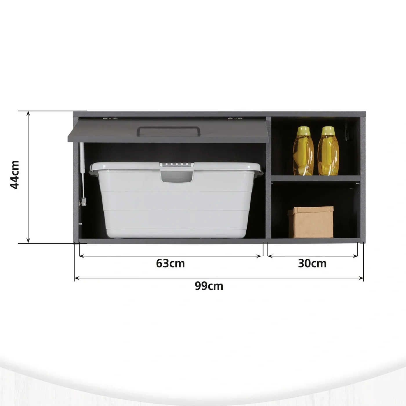 - un pensile sospeso ad un'anta a ribalta con chiusura soft close e di 3 ampi vani contenitori di cui 2 a giorno, ideale per contenere oggetti come asciugamani, detersivi o altri strumenti per la pulizia. Le maniglie sono in alluminio.