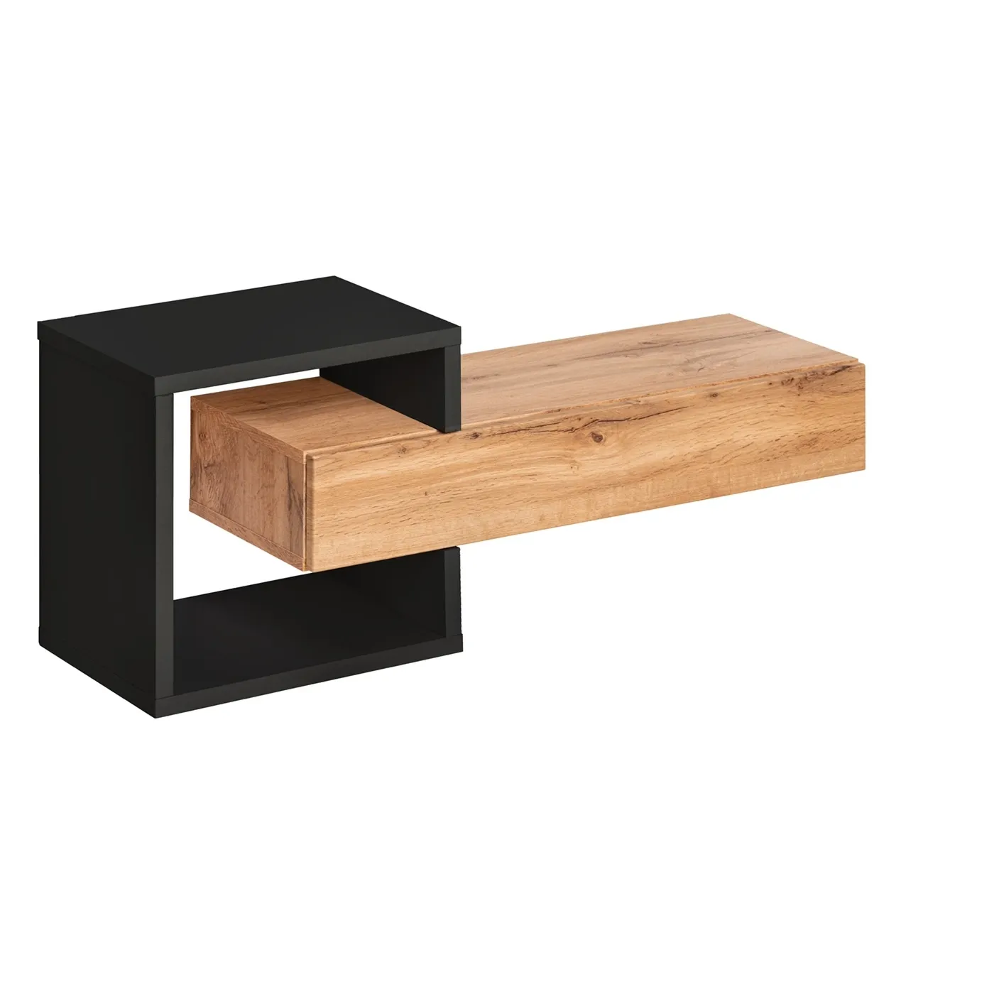 Il mobile si divide in parti diverse: un cubo aperto di colore Nero, molto presente fra i pezzi di questa collezione, e di una mensola con un cassetto in finitura Rovere wotan.