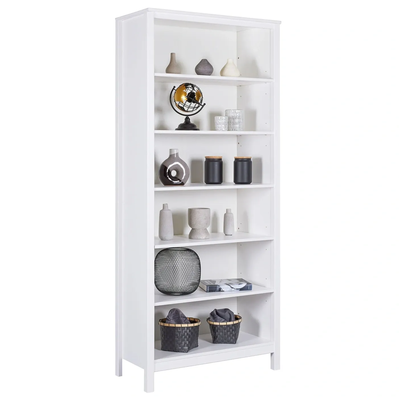 Composizione moderna di libreria larga a 5 ripiani e scaffalatura con 6 vani a giorno. La composizione è disponibile in finitura Bianco laccato e venato.