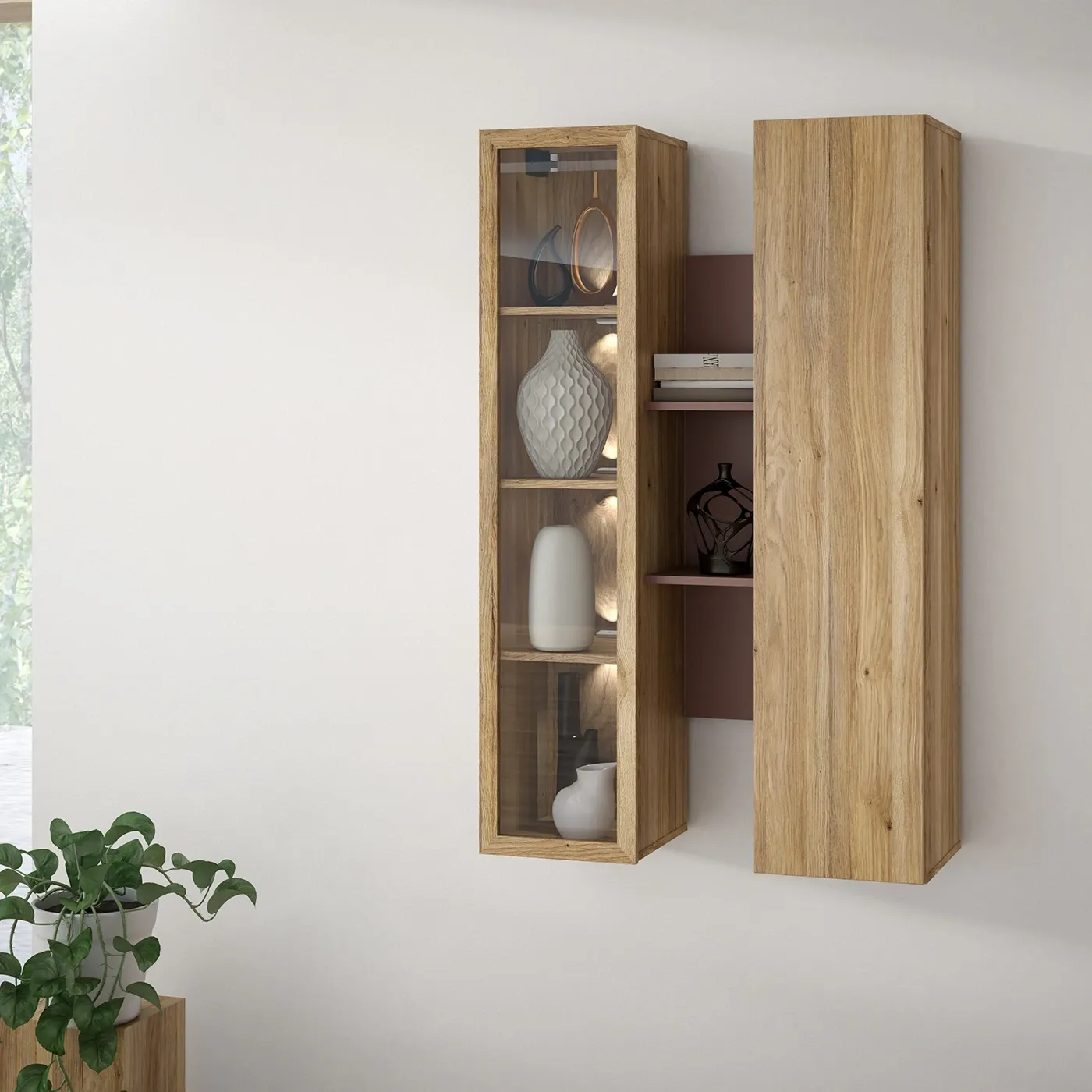 Composizione di pensili sospesa con vetrina e libreria, L.84 H.136 P.34, Terracotta e Rovere mauvella