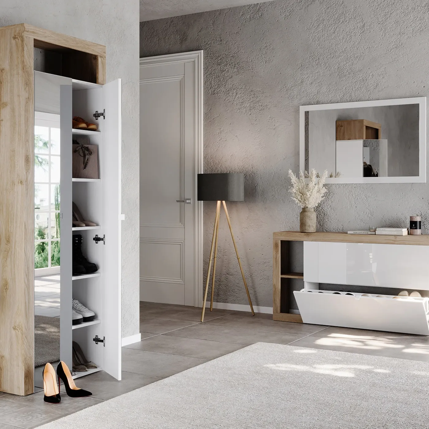 La restante parte in finitura Bianco lucido presenta 2 ante con specchi che rendono l'articolo adatto nel contesto di una cabina armadio o della zona ingresso.