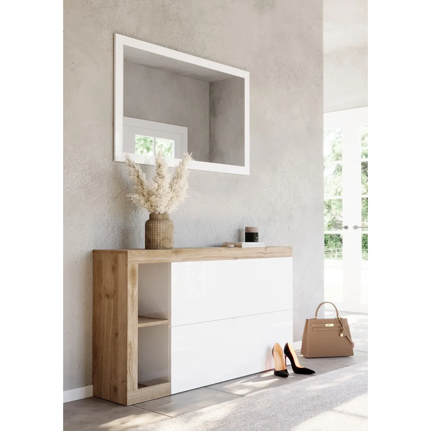 - Una scarpiera bassa in finitura Bianco lucido dalla particolare fisionomia per via dell'aggiunta a lato di una struttura color Cadiz che forma con il resto della scarpiera un vano alto e stretto dove poter contenere ulteriori paia di scarpe o esporre altri oggetti o soprammobili.