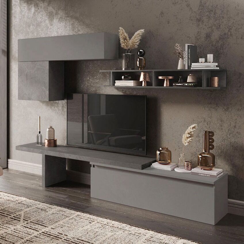 Inoltre è formata da una grande mensola perfetta per appoggiare la TV, una libreria sospesa per contenere tutti i vostri soprammobili di design, un pratico pensile sospeso e infine un cubo ad anta battente.