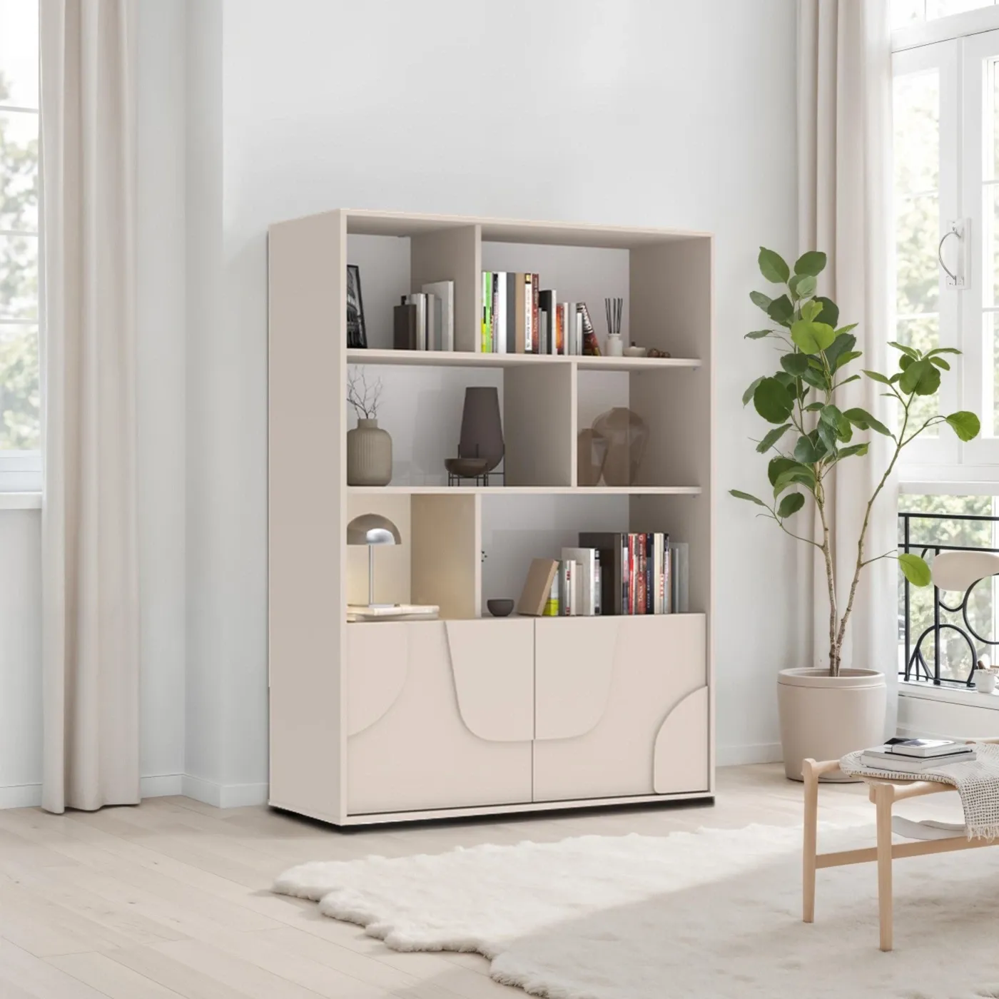La struttura, nella raffinata finitura Cashmere, gioca con i volumi: la parte superiore offre 6 dinamici vani a giorno e 2 comodi ripiani, perfetti per esporre libri e oggetti di design, mentre la sezione inferiore cela un generoso scomparto protetto da 2 ante.