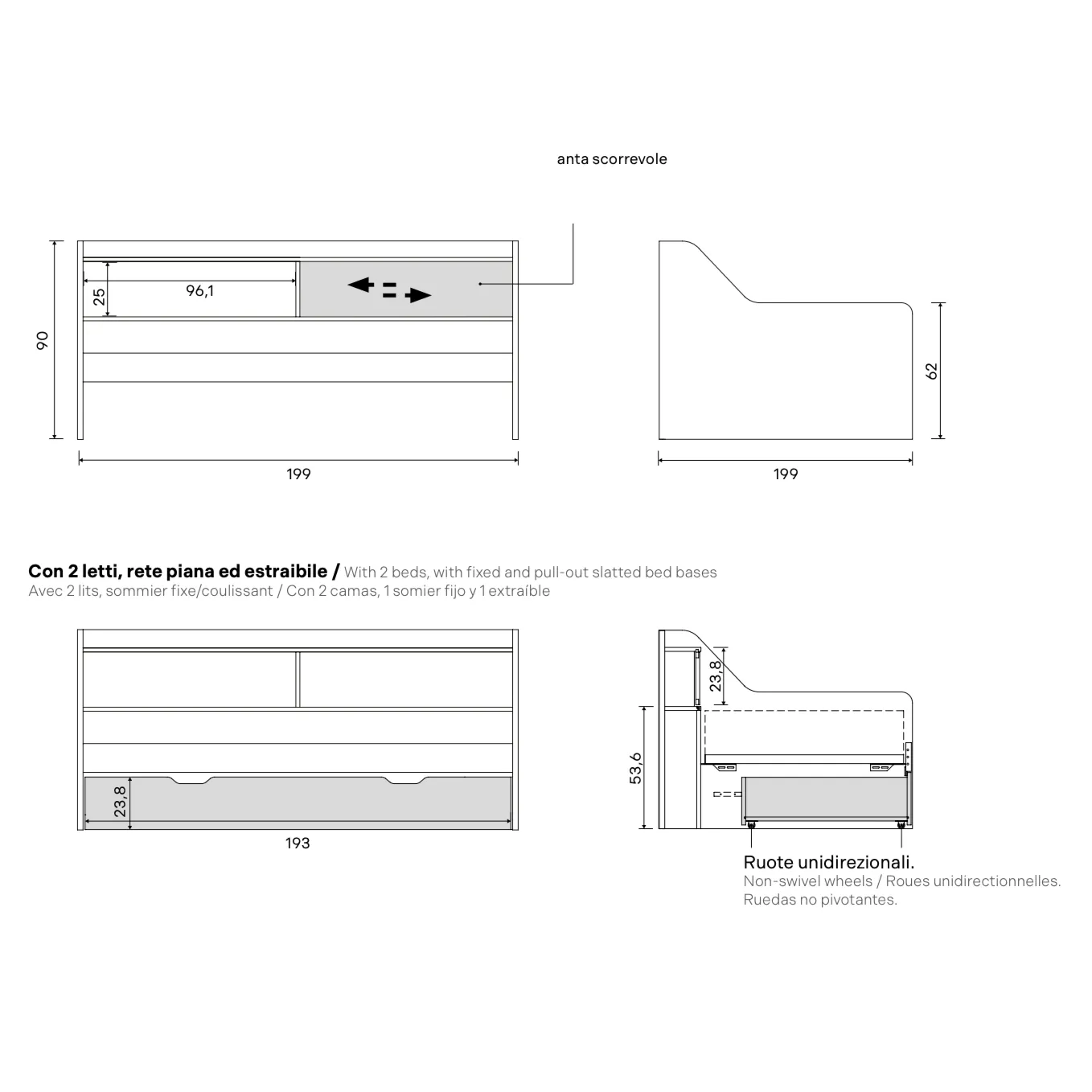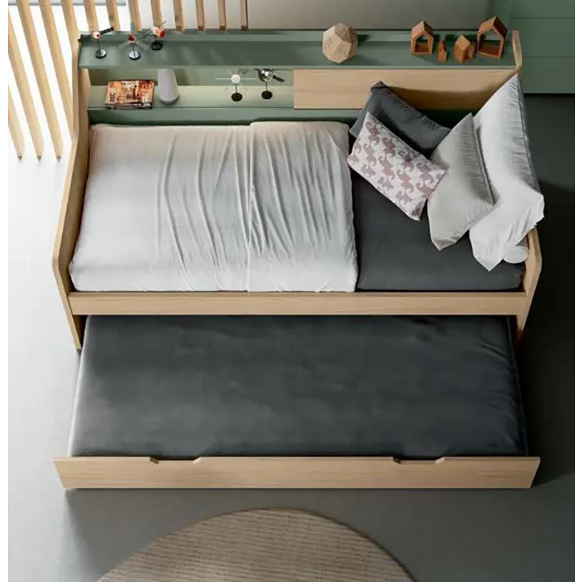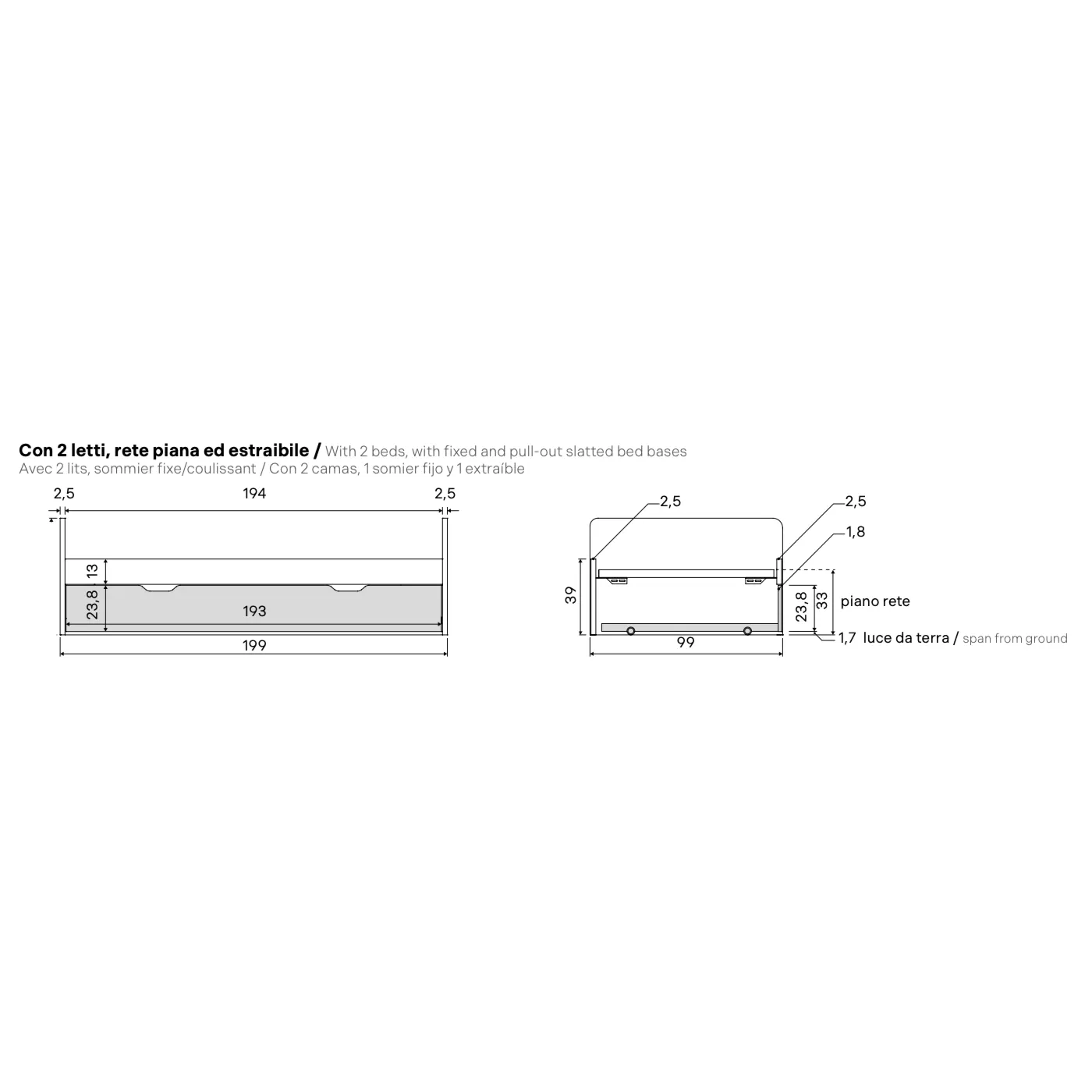 Nella parte inferiore si trova un ampio cassettone che ospita un secondo letto estraibile. È la soluzione perfetta per ospitare un amico all'ultimo momento o per avere un letto extra senza occupare spazio durante il giorno.